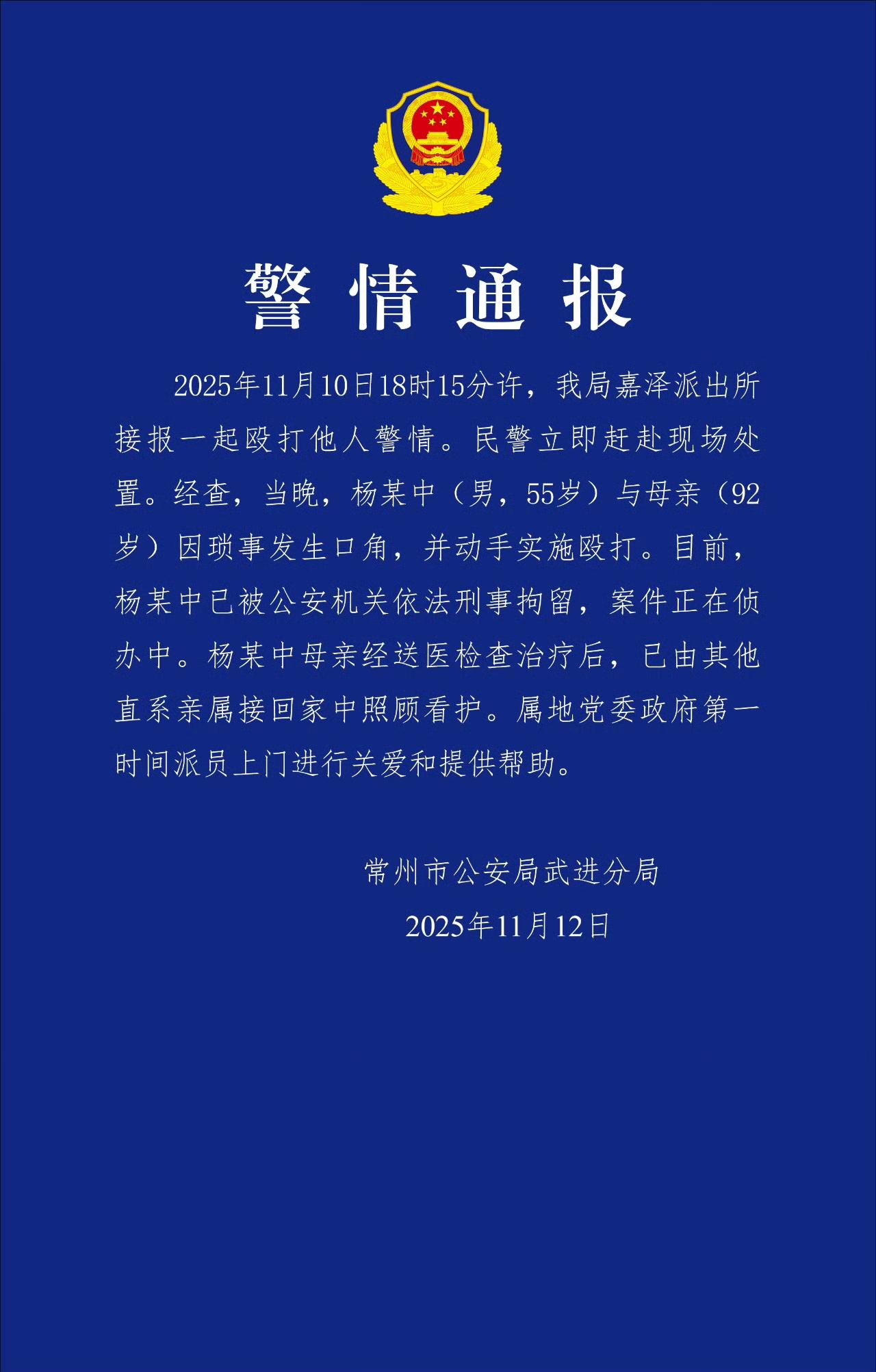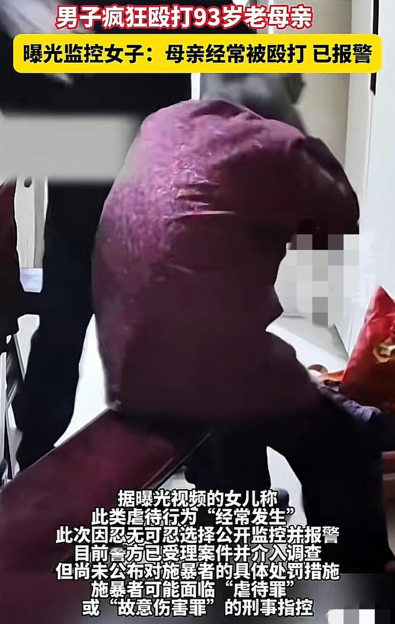 气炸了🤯!55岁儿子暴打92岁母亲被刑拘,网友怒喊:必须严惩! 刷到江苏常州这则新闻,真的越看越生气!55岁的杨某中,就因为点琐事和92岁老母亲拌了几句嘴,居然动手殴打老人,监控里老人无助哭喊的样子,真让人心疼! 幸好警方火速出击,现在杨某中已经被依法刑拘,老人经治疗后也被亲属接回家照顾,属地政府还上门提供了帮助,这波处置必须点赞!都说“百善孝为先”,母亲含辛茹苦把他养到55岁,不说养老尽孝,居然动手伤人,这不仅突破道德底线,更是触碰了法律红线——家暴从来不是家事,殴打老人更是重罪! 你觉得该如何杜绝这类伤老行为?对于殴打父母的人,该加重处罚吗?评论区聊聊你的看法,一起为敬老爱老发声! 严惩家暴 敬老爱老 正能量 法律底线不可碰