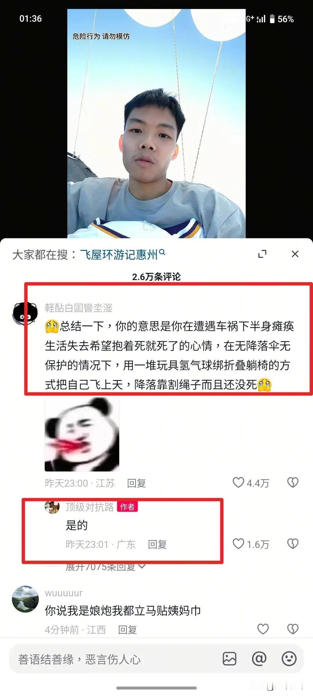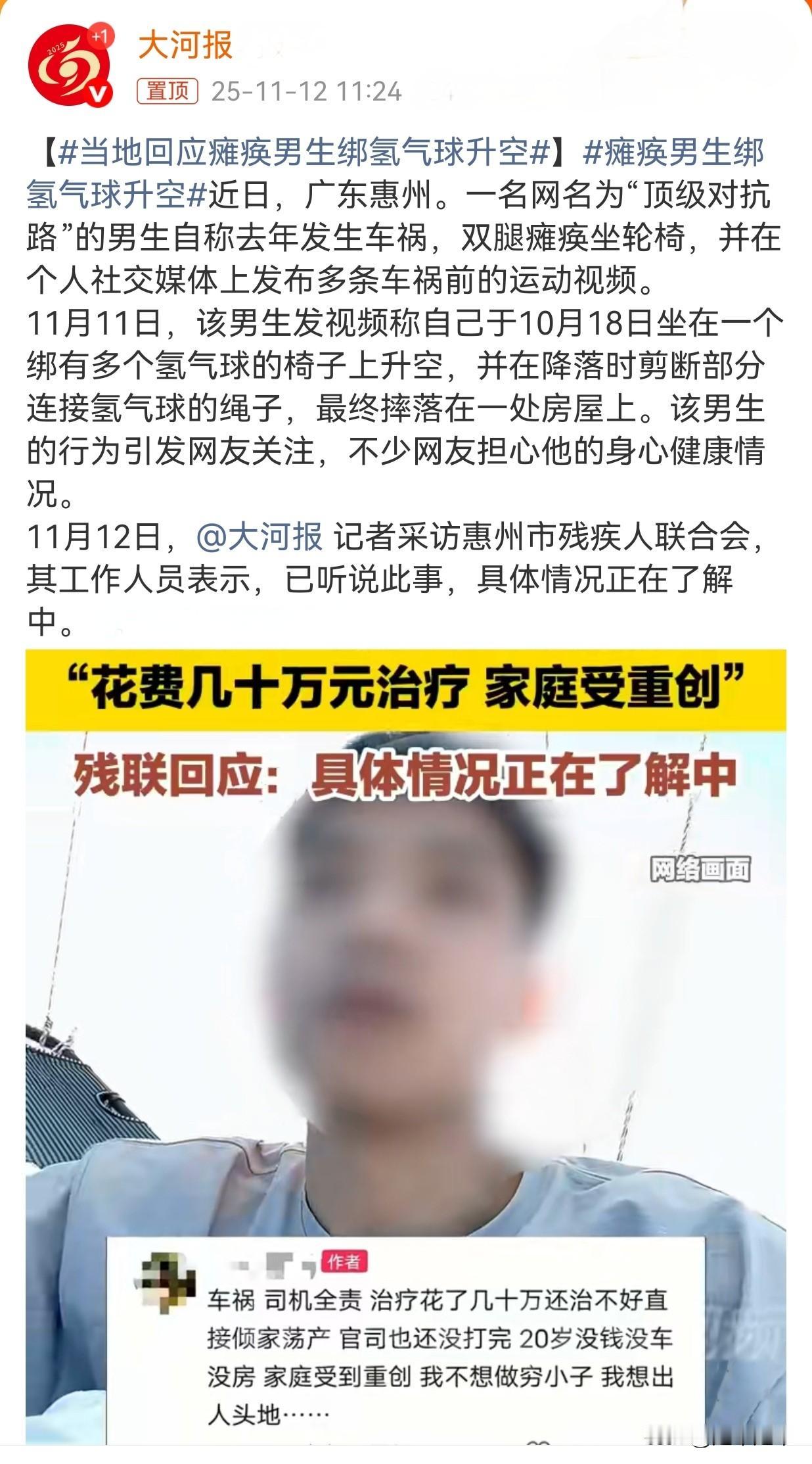 瘫痪男生绑氢气球升空事件,是真实的还是炒作?! 11月12号媒体报道了,广东惠州网名为“顶级对抗路”的男性,自称因24年车祸导致双腿瘫痪,日常需坐轮椅。其个人社交媒体曾发布车祸前的运动视频,25年10月18日,该男生将多个氢气球绑在折叠椅上,无任何安全措施升空。降落时通过剪断部分气球绳子控制高度,最终摔落至一处房屋屋顶。当事人自称昏迷后送医,诊断为颈椎骨裂,住院3天后出院,但头部仍有疼痛。手机等物品在坠落时丢失。男生于11月11日发布升空过程视频,引发广泛关注。 看这个新闻我有两个问题在心中质疑。其一是在想他做出这样的行为,到底是失去了对生的渴望,还是因为身体行为受限,他想挑战一下这种能在一定程度上带他体验片刻自由的事物。他掉下来万一砸到人怎么办,自己明明就是受害者,万一又导致另一个人因为他的行为受伤怎么办?他是不是因为伤残后心理有了障碍,对自己的生命安全漠视了。其二根据视频中信息,升空的气球绝不是娱乐园里面卖的那种,使用的气球体型巨大,在没有外力协助的情况下是如何购买到充气的气体的?又是如何给气球充气的?要是有外人协助的话,就太可怕了。动机是什么?目的又何在? 惠州市残疾人联合会(11月12日回应)已听说此事,具体情况正在了解中,尚未公布进一步处理措施。朋友们能说说你们的看法吗[作揖][握手]
