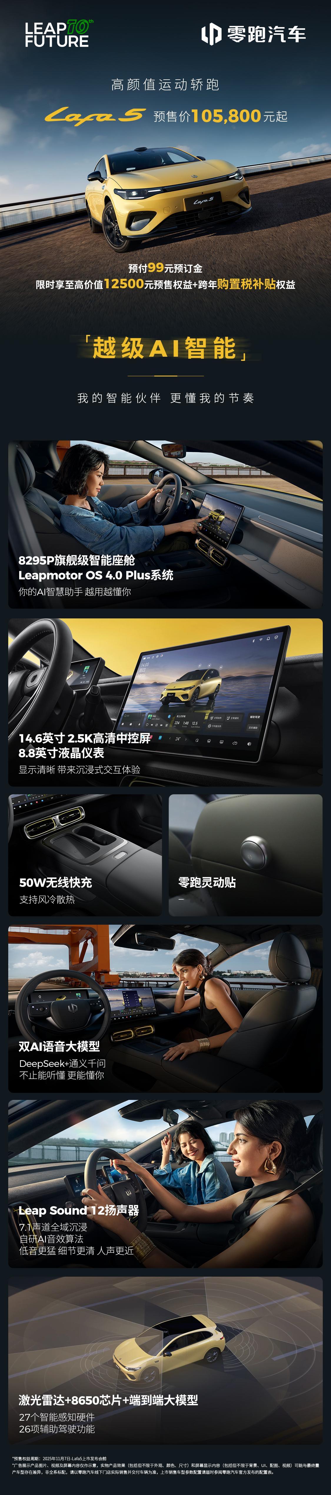 一图读懂零跑Lafa5越级AI智能✅旗舰智舱:搭载Leapmotor OS 4.0 Plus系统,交互流畅顺滑✅双AI助手:DeepSeek+通义千问,听懂所说,更懂所想✅辅助驾驶:激光雷达+8650芯片+端到端大模型,驾驶更从容自信哪一个智能亮点最让你心动?评论区聊聊!🎁【转发+关注】11月19日12:00随机抽一位小伙伴送出零跑定制1:64趣玩版车模(随机款)1个