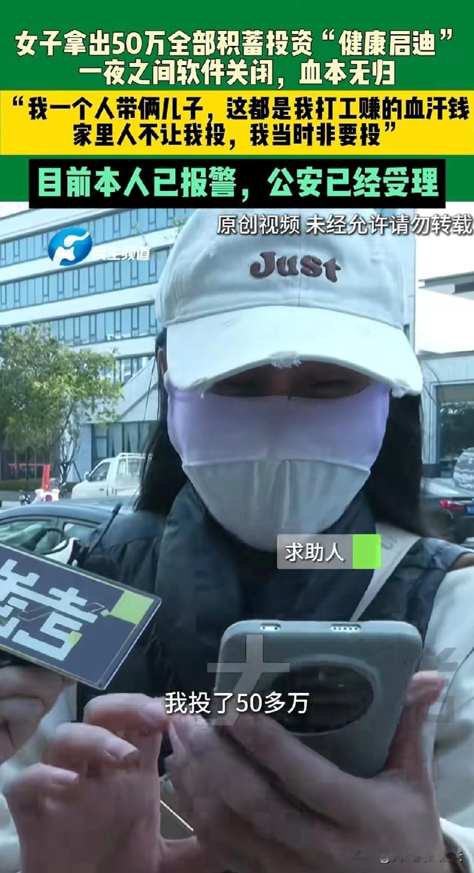 河南,单亲妈妈不听家人劝告,执意把自己积攒多年的50多万投资到一个医药平台。结果她投资后不久,平台就打不开了。 女子急的大哭,她说这些年来她一个人带两个孩子,好不容易才攒了这些钱,这下子全没了。她现在肠子都快悔青了,当初她投资时家人不让她投,她非得投。 其实受骗的也不光这个女子,全国各地都有。他们有被骗几万,十几、几十万不等。 他们投资的一个叫健康启迪协会的公司,当初工作人员给他们介绍公司是做医疗器械和药品的,还卖抗癌药。他们对接的都是全球有名的大公司,投资者觉得这么大的公司,信誉有保障,不会垮。 投资者投资的方法也很简单,只要在平台里买产品,就能每月得到公司的分红。 有些投资者,开始不放心,怕被骗,就个投一两万,后来看到真的得到分红了,又开始追加资金。结果突然平台就打不开了。 现在被骗的有几千个人,已经报警了。可是这些人的钱,能回来多少呢?谁也不知道了。所以任何时候都不要相信那些什么高投资高回报,那都是等着你入坑呢! 对于这件事,你怎么看呢?