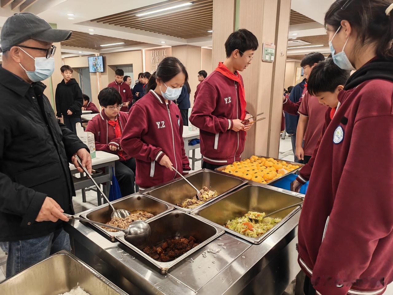 晚餐是两荤一素, 但是学校食堂得准备三个荤菜, 一个是每个人都有, 另外两个二选一。 还得陪餐的老师打。 于是我一手一个勺子, 按照孩子们的要求, 给他们打菜(如图)。 除了饭菜, 还有点心或水果, 还有汤。 饭管够, 菜不够的话, 食堂还有专门的补给车, 巡回补充。 什么? 菜金交多少? 16块人民币。
