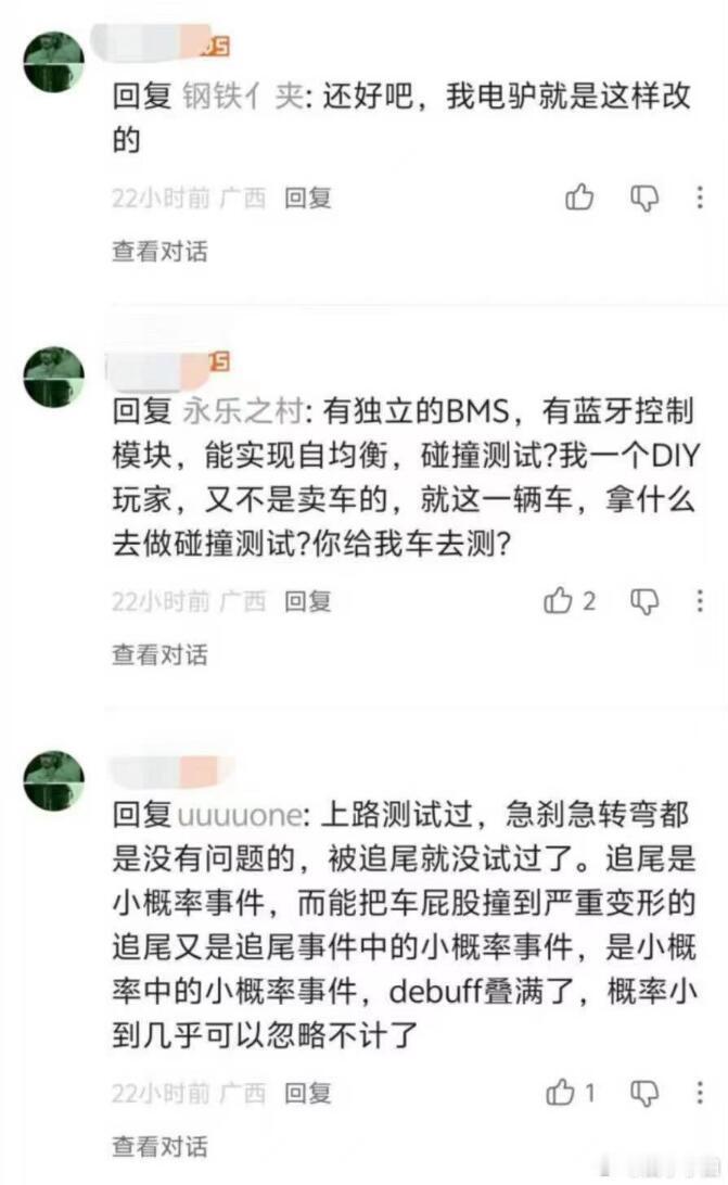 哎!见识物种多样性每天背着个炸弹满街跑还拉着自己的老婆孩子自己也清楚追尾有多严重,却选择“安慰”自己自己说自己的电驴是这样改的电驴什么速度,电车什么速度?电驴多大电池,电车多大电池?不行了……越看越生气😠