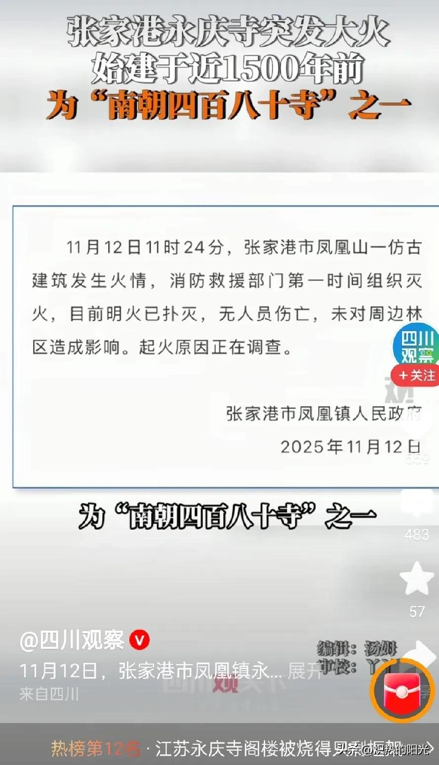 看到这一消息,真的好难过 今天看到张家港永庆寺着火的新闻,真的太让人揪心了! 千年古寺永庆寺今天突发大火,“南朝四百八十寺”又少一座[泣不成声][泣不成声][泣不成声] 上午11点多,这座始建于近1500年前、属于“南朝四百八十寺”之一的古寺突发火情。从视频里能看到,寺庙的阁楼被烧得只剩框架,浓烟滚滚,真的太让人惋惜了 好在消防部门第一时间扑救,现在明火已经灭了,也没有人员伤亡,没影响到周边林区,不过起火原因还在调查中 想想这座寺,经历了近千年的风雨,却在今天遭遇这样的意外,真的是文化遗产的损失啊!希望后续能查明原因,也盼着能有妥善的修复方案,让这份历史印记能尽量留存下来[祈祷][祈祷][祈祷] 永庆寺火灾 南朝古寺