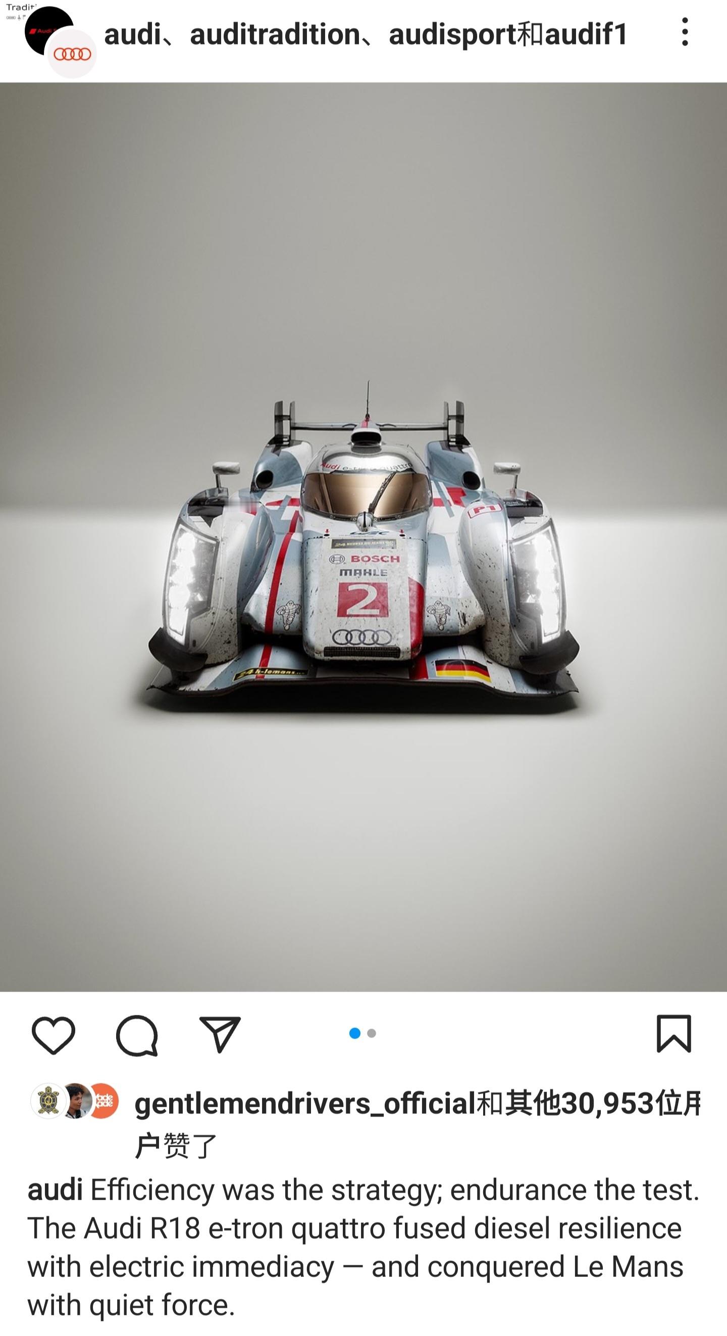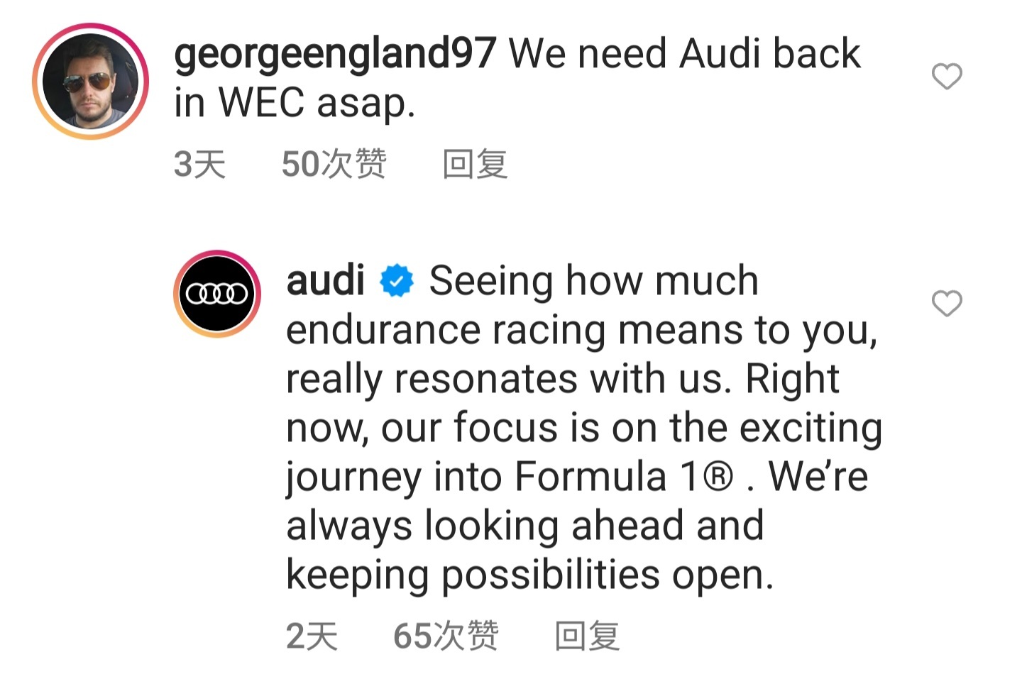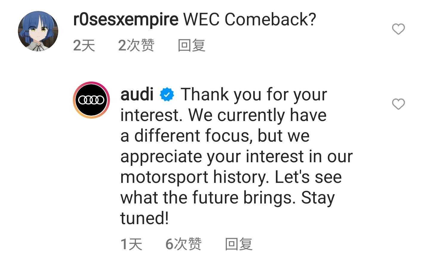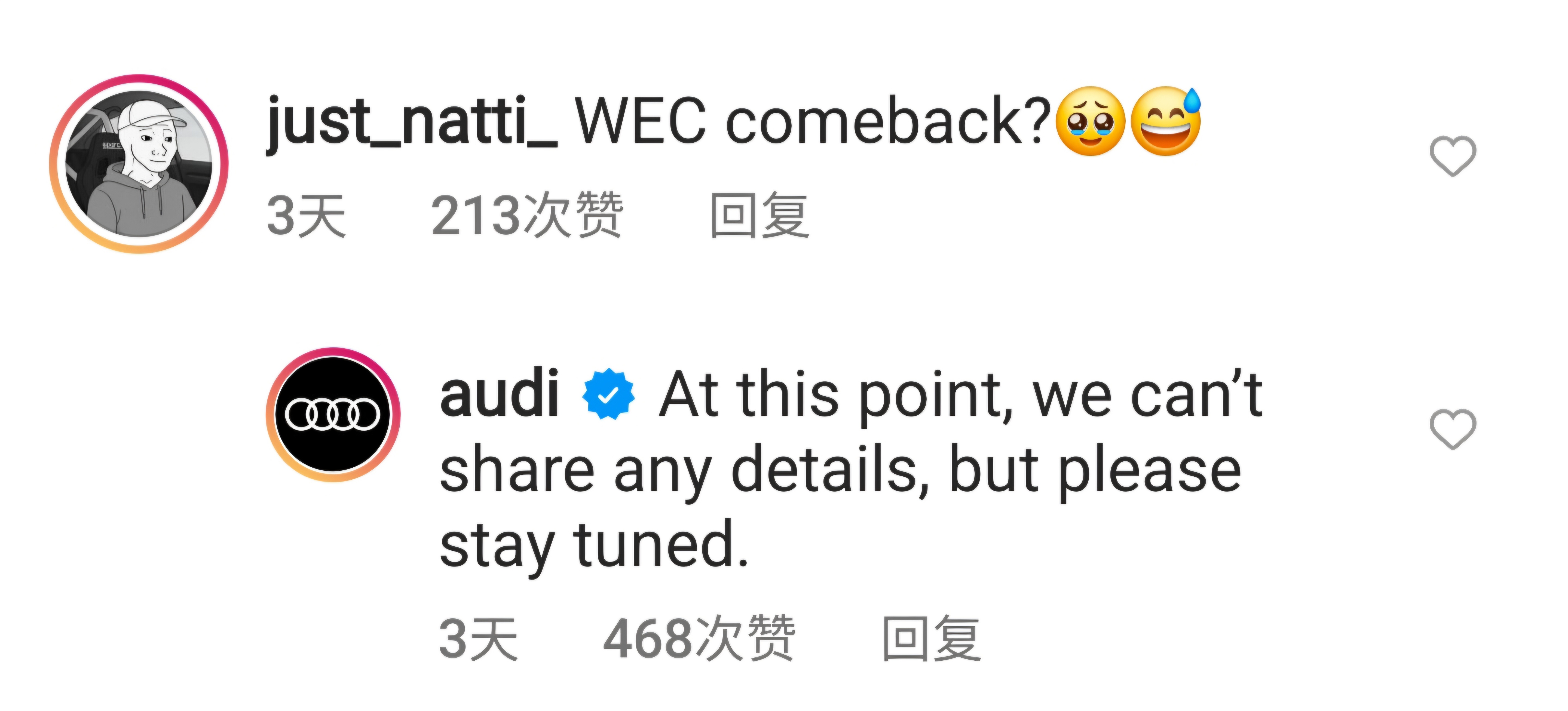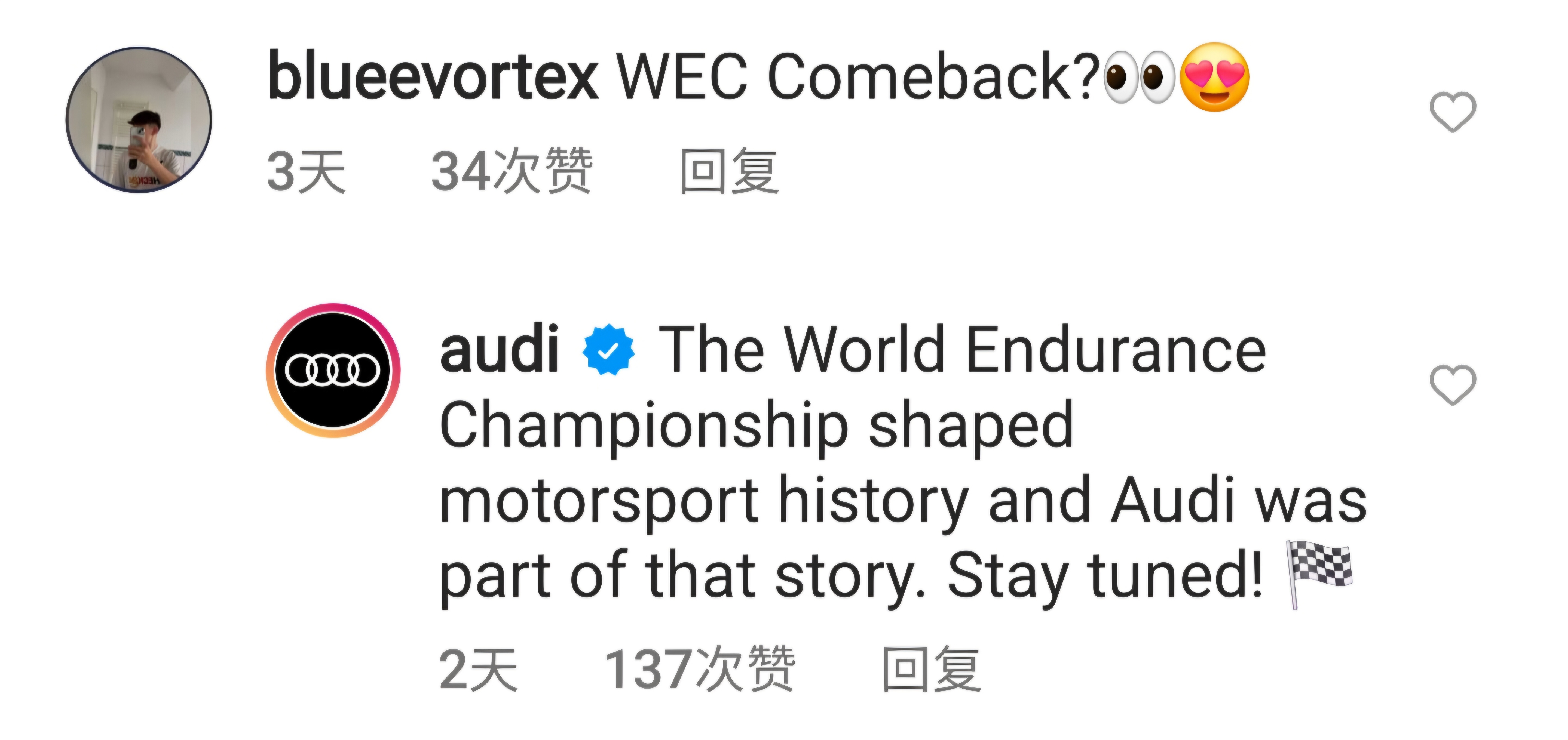 奥迪暗示回归WEC,早晚的事?在官方的一条R18e-tron的图文评论区,回