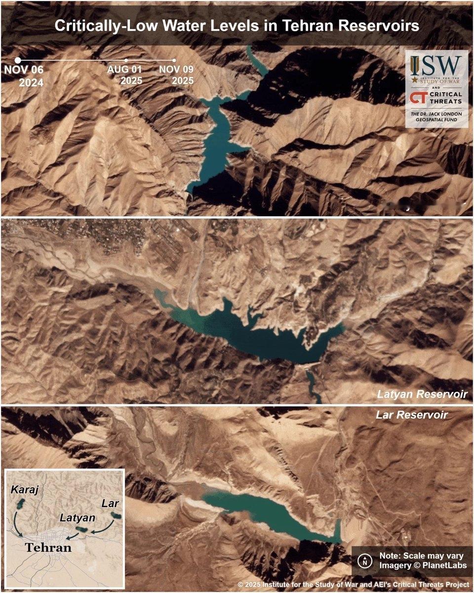 伊朗正面临水资源和汽油短缺,导致其国内形势不稳定。 据战争研究所ISW报道,德黑兰地区正面临前所未有的水资源短缺危机,原因包括长期干旱、过度消耗和管理不善。 伊朗能源部下属的水资源研究所于11月7日表示,德黑兰10月和11月均未降雨,而通常这两个月应有50-60毫米的降雨。因此必须为危机做好准备。这场干旱已导致德黑兰水库蓄水量降至约2.5亿立方米,而上一个波斯历年约为4.9亿立方米。 伊朗总统马苏德·佩泽什基安11月7日称,如果不下雨,德黑兰可能在12月实施配给制;如果水荒持续,居民将不得不撤离德黑兰。 伊朗能源部长阿巴斯·阿利亚巴迪11月9日宣布,如果水资源短缺持续,水务公司可能在德黑兰部分地区切断供水,并建议伊朗人安装家用储水系统以作准备。一位伊朗水务行业官员11月9日表示,夜间将降低水压,以便城市水库得以补充。分析认为这次伊朗水资源短缺危机,显示伊朗无力满足民众需求,可能引发骚乱。 与此同时,伊朗国内还面临汽油危机,这也将加剧国内不稳定。佩泽什基安10月23日表示,汽油价格“可能不得不”上涨。 一名伊朗议员11月8日声称,伊朗预算已无钱进口汽油。伊朗议员11月10日致信佩泽什基安,敦促他解决日益恶化的汽油危机。信中指出,伊朗国内汽油产量每天短缺2000万升,不得不高价进口。而这些进口又随之加重伊朗预算负担并恶化通胀。 2019年,就因为汽油价格上涨而引发伊朗全国性抗议。