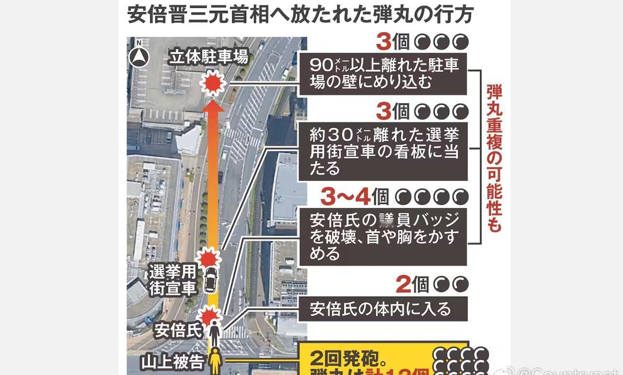 【审判初期就被检方证据击破的“狙击手”说法:并不存在“真正的狙击手”】海外新鲜事 被控谋杀前日本首相安倍晋三的嫌犯山上徹也(45岁)在奈良地方法院接受非专业法官合议庭审理,庭审已进行六次,控辩双方着重就案发经过、枪弹轨迹与法医学证据展开质证。围绕案件流传的“另有一名狙击手”“特殊子弹”等阴谋论,在检方提交的一系列物证与专家证词面前已被驳斥。 检方证据链:单一枪手与弹道相符 出庭作证的证人包括对尸体进行检验的法医、负责弹道比对的警官以及分析自制枪支的技术专家。检方出示的证据显示: 被告使用自制枪向安倍开了两枪,所用枪械可发射多枚铅弹,弹径约9毫米。两枚进入人体的子弹分别命中左肩附近和右颈前部。 尸检显示,击中左肩的子弹损伤了靠近心脏的一条动脉,造成大量内出血并几乎当场致命;击中颈部的弹头穿过右胸,导致右肱骨骨折,但并非致命伤。法医并出示了相关照片和切片,解释伤情与弹道走向的对应关系。 警方在现场及周边找到多个弹痕:安倍附近的两面旗帜上有弹孔、约30米外的竞选车上有弹孔,多层停车场墙壁上甚至发现被打入的弹头。警方将这些弹痕与枪口方向连线,形成连续且一致的弹道图,指向同一来源射击。 当局开展的射击测试表明,该自制枪的杀伤力约为“最低致死值”的8至12倍,足以造成致命伤害。 检方因此在法庭上明确表示,现有证据支持“单一枪手实施”的结论,旨在消除公众与陪审员对所谓“第三方枪手”或“替罪羊”说法的疑虑。 关于“特殊子弹”和子弹未回收的解释 针对一种流传甚广的说法——“致命子弹已溶解或消失”——法医在庭上解释,导致致命伤的子弹尚未在体外发现,可能是随大量胸腔出血而被吸入体内,或留在尚未检出的胸腔深处,并非必须推断为使用“可溶子弹”。这一解释与现场其他弹着点与弹道证据一并,被检方用来反驳“特殊弹药”论。 伤势与姿态:视频与病理证词相互印证 关于“子弹从上方斜射入颈部,显示来自高处狙击手”的推测,庭审中也有详尽讨论。法医指出,若受害人在中弹时右臂抬起,子弹由上向下穿入并造成肱骨骨折并非不可能。回放事发视频可见,安倍在中枪瞬间正手持麦克风转身并短暂低头,这一姿势使其上臂位置相对较高,与病理证词相吻合。因此,现场视频与法医弹道分析共同支持单枪手近距离射击的判断。 被告的动机与作案准备:目标在一周内由“宗教领袖”改为安倍 庭审中还披露了被告的长期准备与动机细节。控方称,山上对所谓“统一教”(现称世界和平统一家庭联合会)怀有深仇,因其母亲大量捐款致家庭负债。山上早在2018年就曾策划袭击该教领导人,并在2019年携带燃烧瓶到访时因犹豫未实施。之后数年他制造自制枪、反复试验,曾表示“需要一把手枪才能更可靠地杀死受害者”。 检方指出,原先目标为该教在韩国的领导人,但因疫情阻隔导致目标无法来日,山上在得知领导人来日受限后,仅在作案前约一周将目标改为“与统一教有关联的政治人物”,最终在7月8日将矛头对准正在街头演讲的安倍,数日内便付诸实施。庭审资料显示,行动的匆促与被告长期积累的武器制造能力共同导致了悲剧。 检方表态:以证据回应阴谋论,消除公众疑虑 检察官在庭上表示,尽管阴谋论在社交媒体上广泛传播,但法庭必须以事实与证据为准,“并非为了挑起阴谋论,而是要消除陪审员及公众的任何疑虑”。目前庭审仍在进行中,控辩双方将继续对关键证人及物证展开质证。 图1:被告人山上哲也