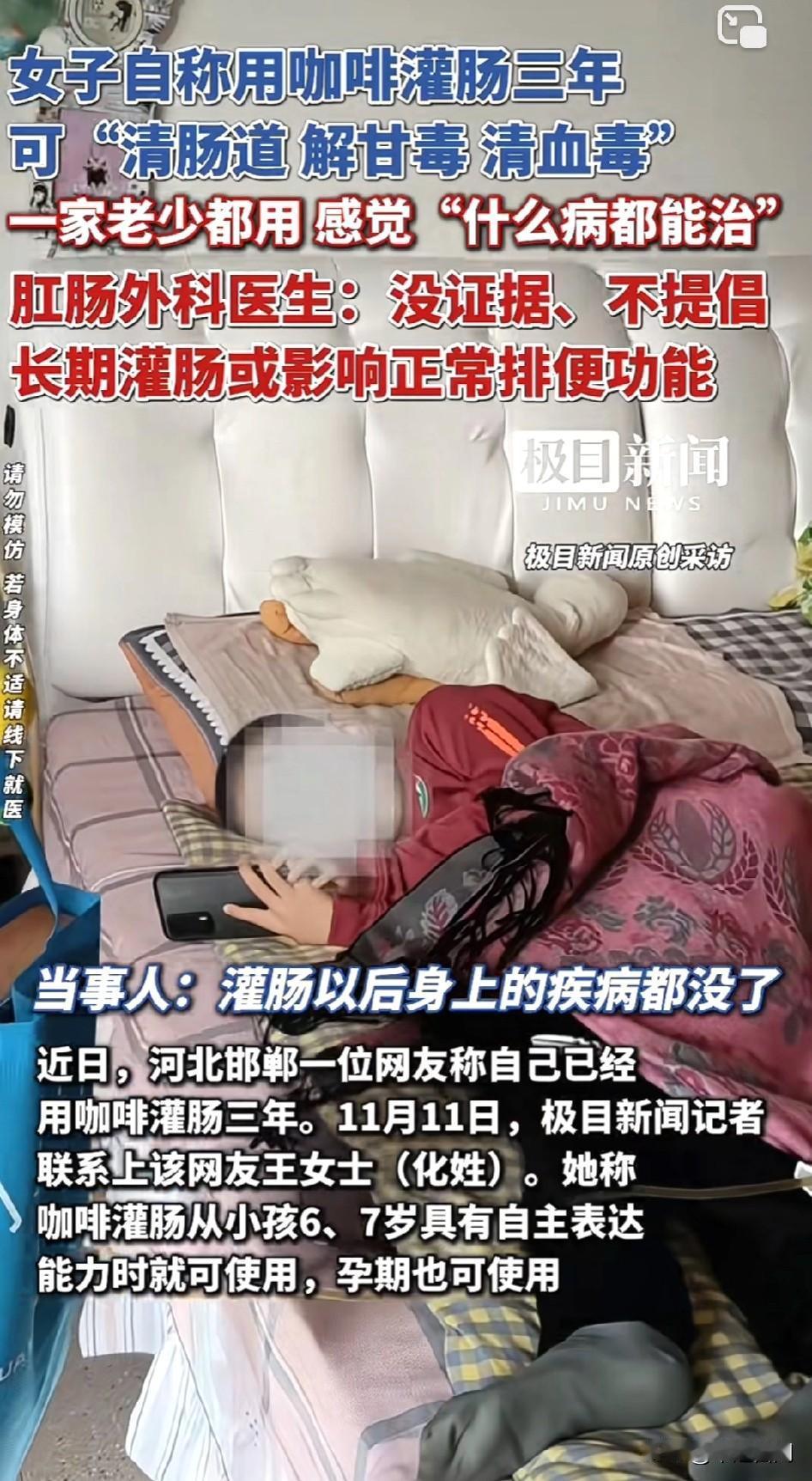 女子感冒发烧都是灌肠治疗,称效果好。 女子自称用咖啡灌肠三年,可“清肠道、解甘毒、清血毒”,一家老少都用,感觉“什么病都能治”。肛肠外科医生:没证据、不提倡! 灌肠多难受啊,直接喝电解质得了,从胃到肠子全排干净!是排毒养颜,确实心经里有句话“腹中长空…”忘了! 意思是没有了大便就是没有了毒素侵害身体,身体会更好。