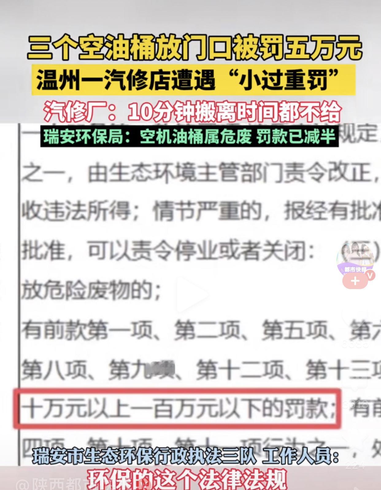 “签字5万,不签10万!” 浙江温州瑞安一家小汽修店门口放置三个空油桶,里面还存着油渣,当地环保工作人员作出了以上的裁决。 于是一堆人替小店主“愤愤不平”:“别让天价罚单寒了小店主的心!”认为这个处理有猫腻。不严厉行吗,大家没忘记前几天江苏南京明尚西苑小区,一电动自动起火15 死,44伤这起事故吧。人家说签字罚5万,不签罚10万,说明这个违法行为罚5万不是顶格,只是最低的处罚,10-100万才算得上正常。 签字说明店主认识到错误,不签字说明认错态度极差,顶格处罚10-100万也不为过。这种情况关键在于,“三个空油桶里面还存着油渣”,这是极具危险性的易燃物品,已经符合被罚条例。执法人员并没有错,要是这样算错,那就寒了执法人员的心,真出事那一天,那就不是5万就能解决问题的了。