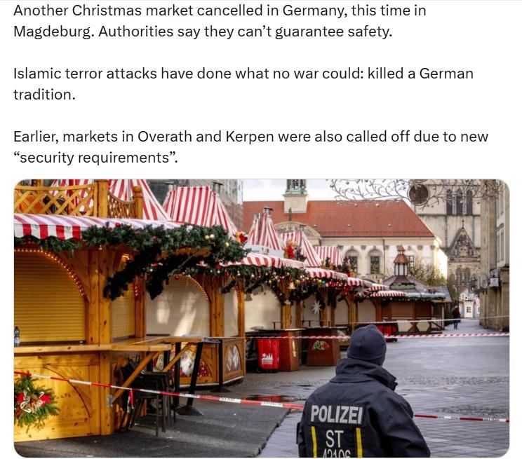 德国又有一个圣诞市集被取消,这次是在马格德堡。当地当局表示,他们无法保证安全。 伊斯兰恐布袭击造成的影响,已经做到了战争都无法做到的事:让德国的传统消亡。 早些时候,奥弗拉特和克彭的圣诞市集也因新的“安全要求”被取消。