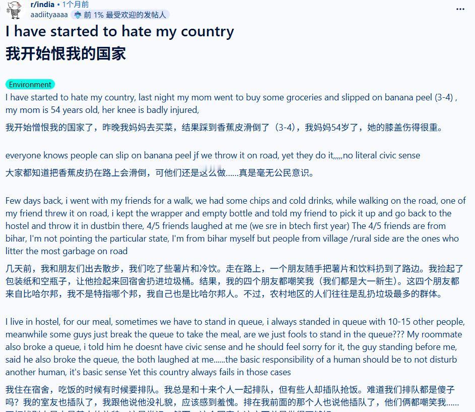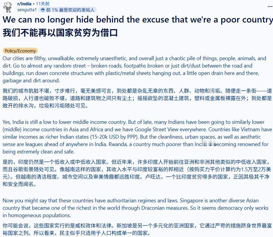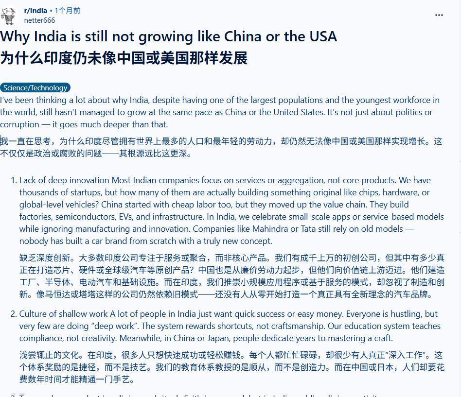 印度并不是因为那次飞机问题。 主要是因为三点: 第一、白人国家不断的指责印度人,尤其是加拿大为主,一个两个还好,越来越多,形成普遍嘲笑印度人的风气。 第二、不少欧美白人现在旅游印度,然后发旅游视频到油管上,就印度那个环境,结果可想而知。 第三、目前白人有意识无意识的把中国和印度对比,我知道很多人不想和印度比,但是龙象之争宣传这么多年,除了外在的大家天差地别,这次对待川普态度差别也很大。 尤其是在印度民族主义者看来,印度这次肯定是向川普低头了的。 搞的现在一度民族主义者都有点殇了,毕竟现在印度态度摆在那。 都不需要特意去挑什么,但凡在印度板块直接搜带china的帖子,全是这样的。