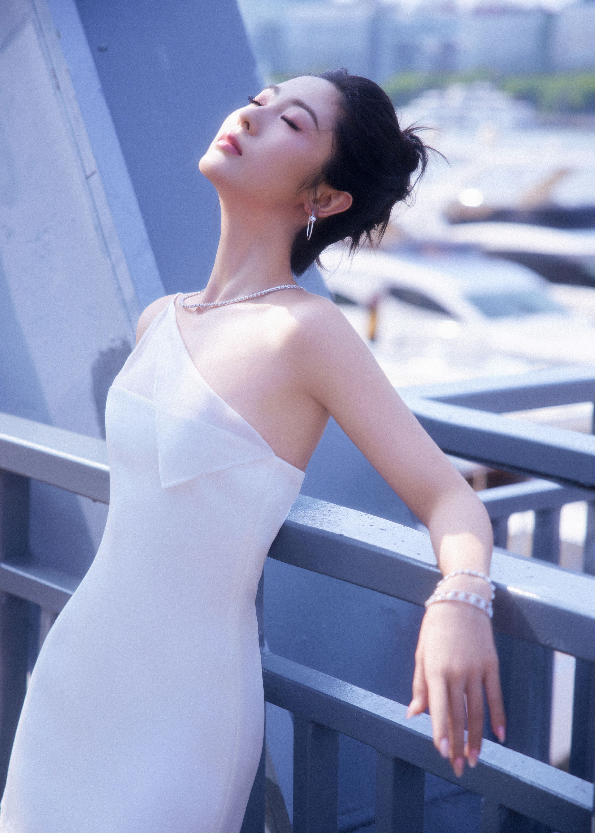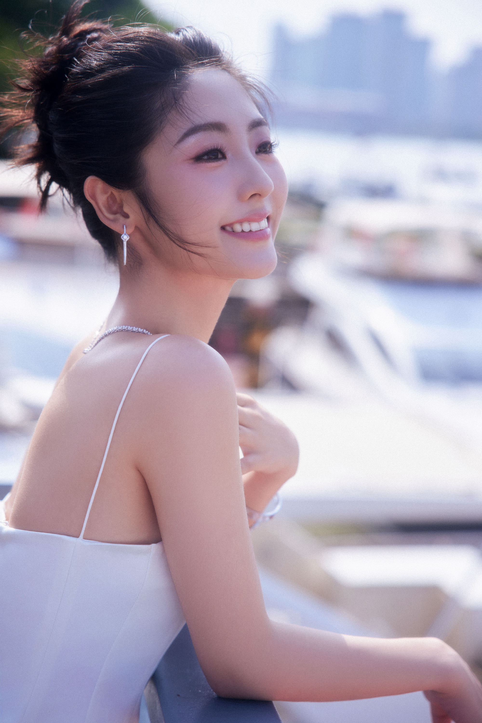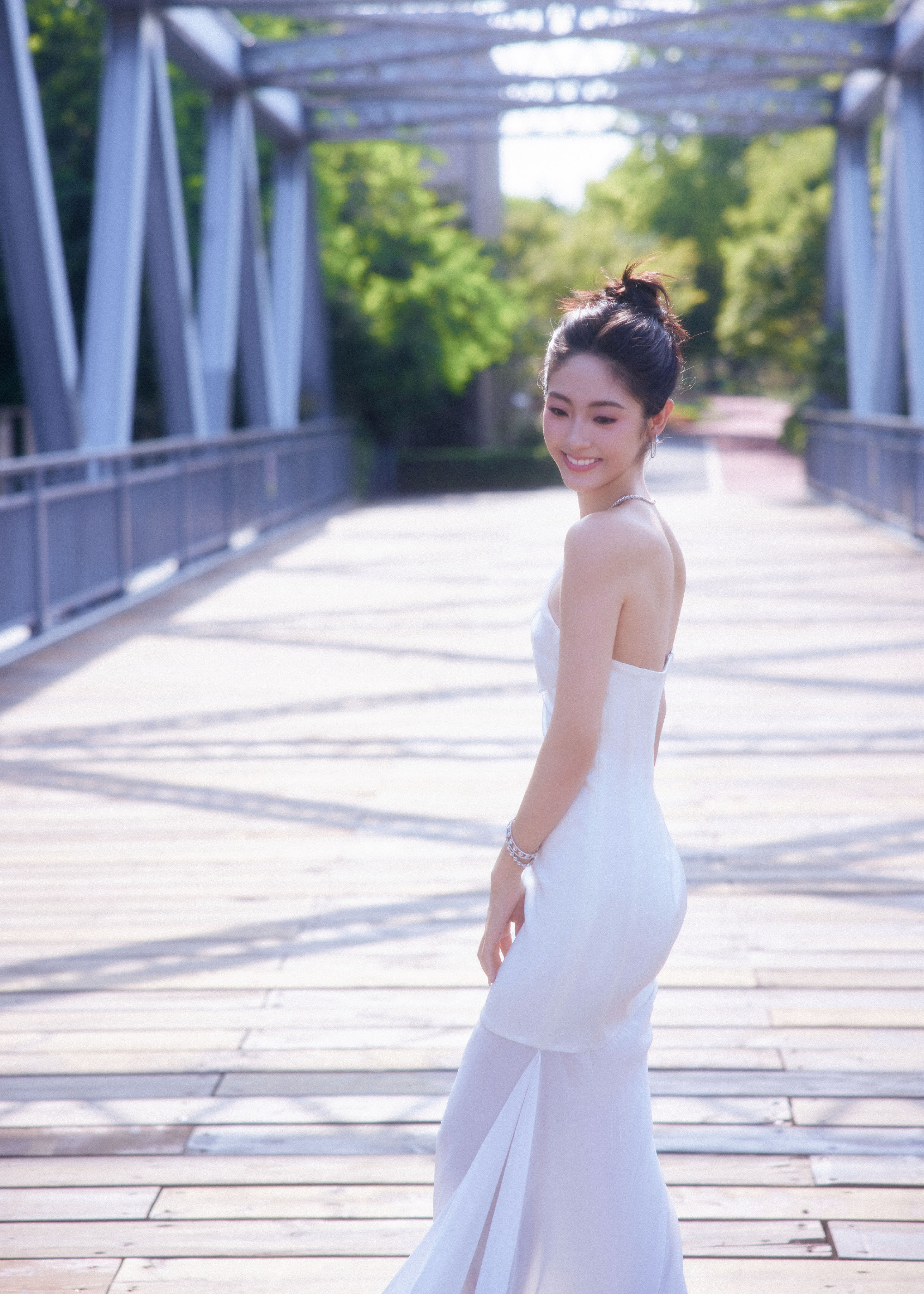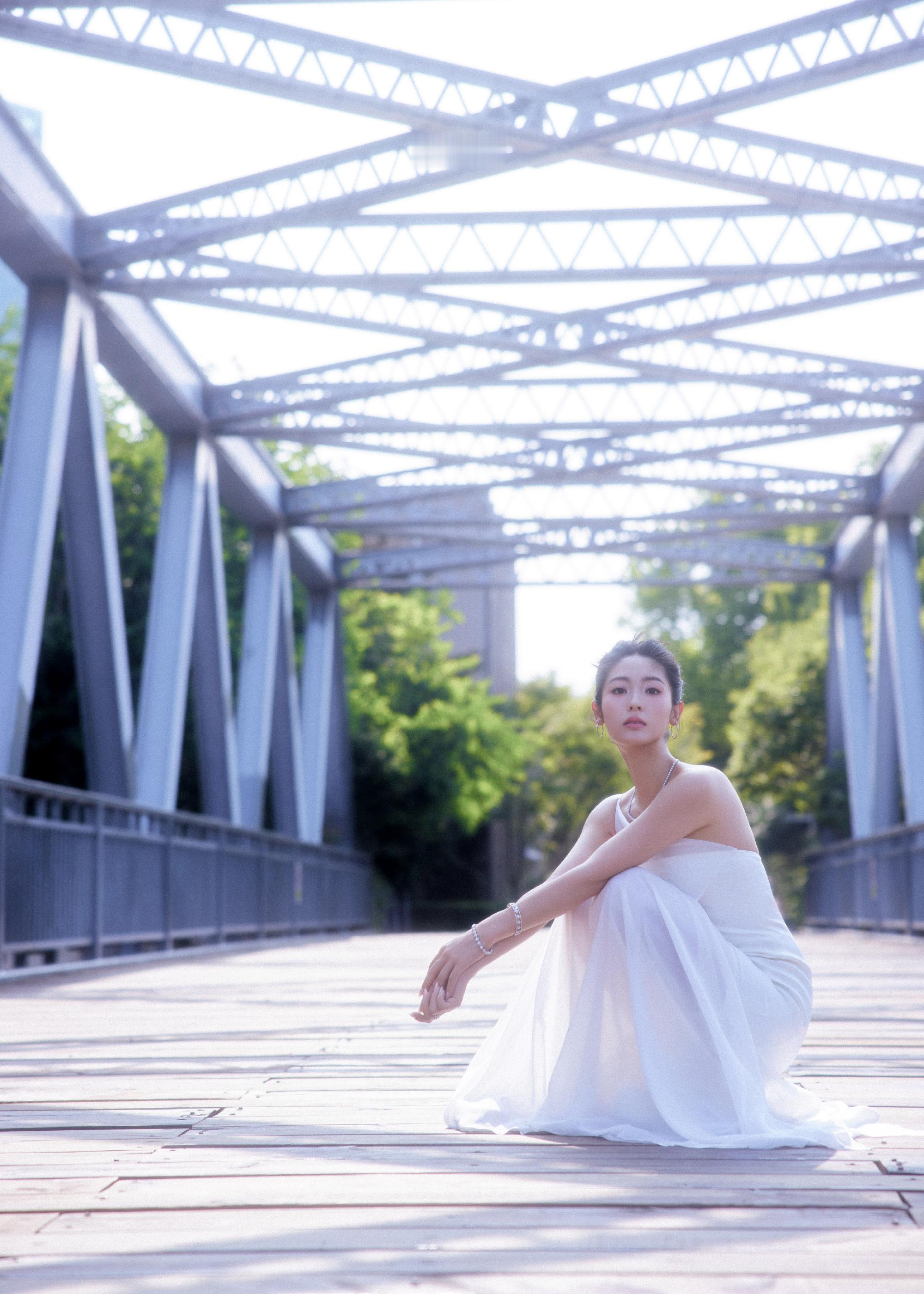 邢菲,一身白色抹胸裙,静谧之秋格调流转