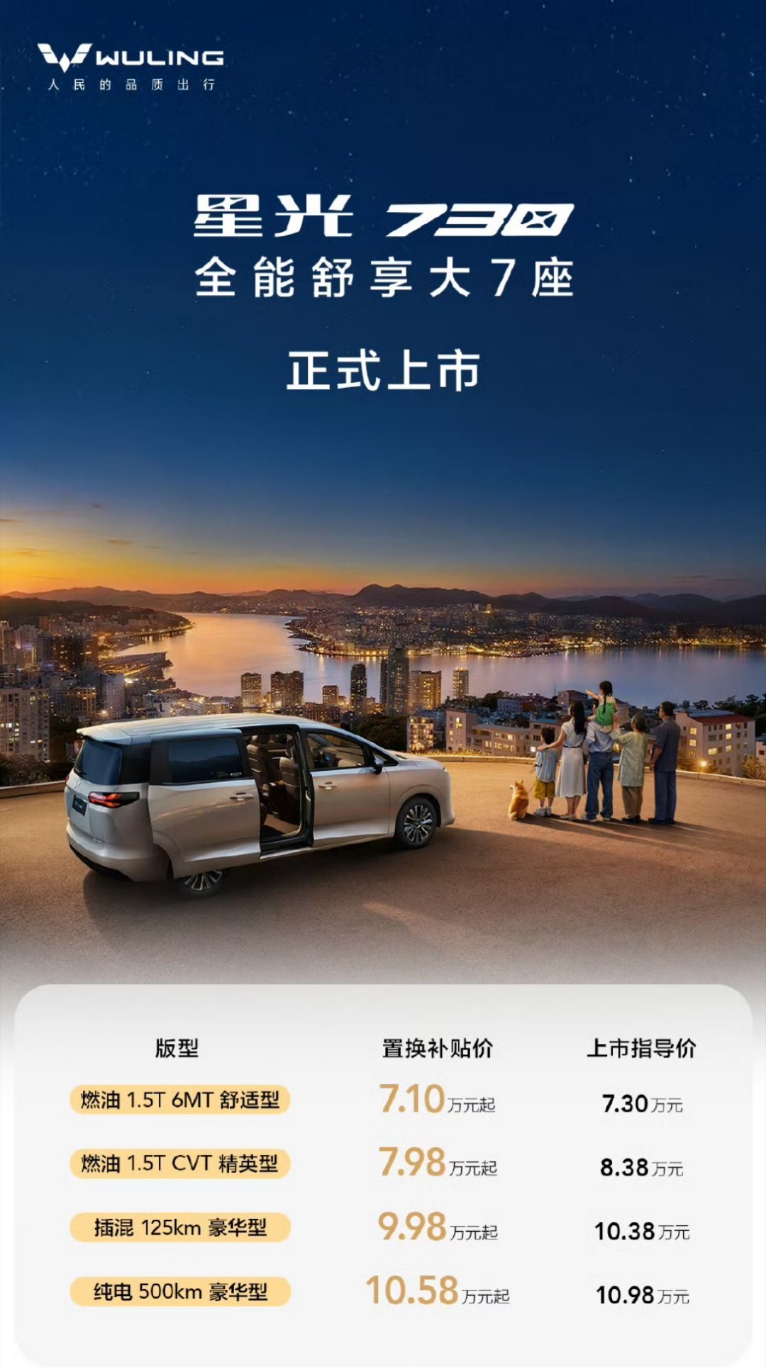 五菱星光730正式上市,售价7.1万起。提供燃油 / 插混 / 纯电三动力;插混版 1100km 综合续航 + 5.3L 亏电油耗;纯电版 500km;燃油版 1.5T 动力;2910mm 超长轴距搭配 2+2+3 布局;1202L 拓展后备厢 + 25 处储物空间;六环高强钢车身 + 三电终身质保,双侧电动侧滑门。大家觉得怎样?