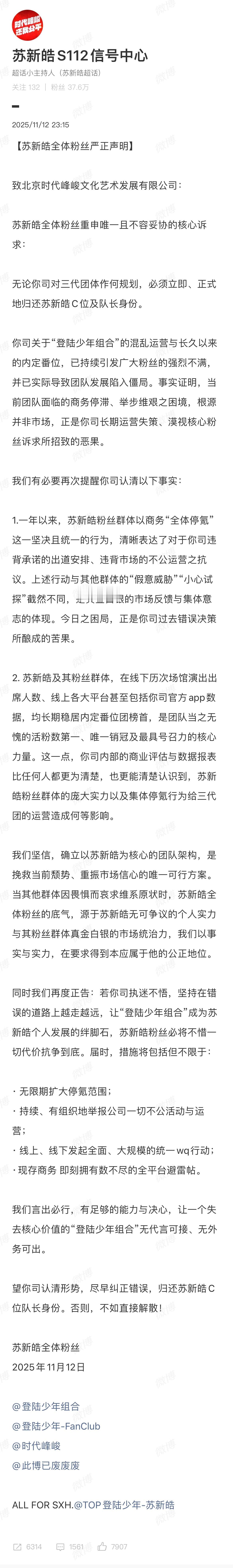 苏新皓家发出声明,无论时代峰峻对三代团体作何规划,必须立即、正式地归还苏新皓C位及队长身份。真正有能力真正坚持做舞台的小孩应该获得公平。