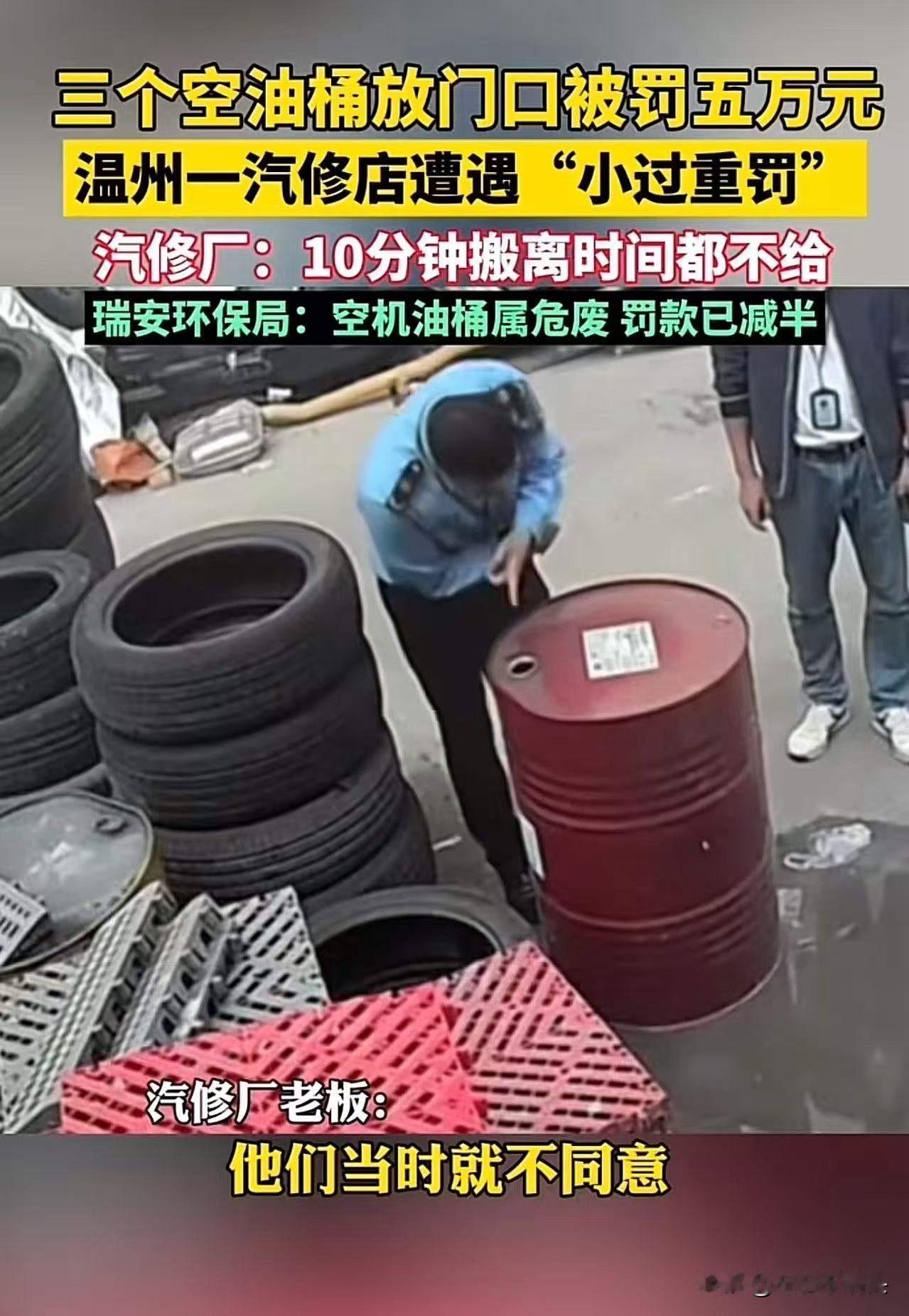 浙江温州,一家汽修店老板遭遇了“天降罚单”!因为将三个空机油桶临时堆放在店门口,被环保部门罚款5万元!老板欲哭无泪:“连10分钟搬离的时间都不给,直接开5万罚单,这不是小过重罚是什么?"而瑞安环保局回应:5万元已是最低处罚标准。 这起看似普通的罚款事件,却折射出我们社会中许多令人深思的现象。温州的这位汽修店老板,或许只是千千万万个小微企业中的一个缩影。在快节奏的生活中,许多创业者为了节省成本、提高效率,不得不在有限的空间里做出一些临时的调整。然而,面对环境保护的严格要求,他们又该如何权衡?难道我们真的要用一纸罚单,来衡量一个小微企业的生存空间吗? 细细想来,这个事件背后隐藏着一个更深层次的问题:我们对“环保”的理解是否过于死板?在环保法规的严格执行下,是否也应考虑到企业的实际困难和人性化管理?就像这位老板说的,连10分钟的时间都没有,难道我们不能给予一些缓冲期?还是说,法律的铁律已经变成了“零容忍”的铁墙,让所有的灵活空间都被无情剥夺? 更令人震惊的是,瑞安环保局的回应——“5万元已是最低处罚标准”——这句话似乎在告诉我们:对待企业的处罚,已经没有任何商量的余地。这种“最低处罚”是否意味着,未来还会有更高的罚款?如果没有合理的沟通和人性化的处理方式,难免会让企业老板们感到愤怒、无助,甚至对环保法规产生抵触情绪。 这起事件,激起了许多人的共鸣:我们是否在追求环境保护的同时,忽视了企业的生存空间?我们是否在严格执行法规的同时,也应该考虑到人性化的管理和合理的宽容?毕竟,一个健康的社会,不应只有铁律,更需要温度。 或许,我们应该反思:如何在环保与发展的矛盾中找到平衡点?如何让法规成为保护而不是压迫的工具?这不仅仅是温州一家的问题,更是全国乃至全球都在面对的挑战。我们期待一个既能守护蓝天白云,又能扶持小微企业的智慧方案,而不是一味的“罚款”和“惩戒”。 这件事情,让我们看到了制度的冷漠,也提醒我们每一个人:在追求美好生活的路上,理解和包容才是最珍贵的力量。也许,下次我们看到类似的新闻时,不妨多一些理解和思考,也许,下一次的“天降罚单”,可以变成“温情的提醒”。 罚单 瑞安烧机油治理 废旧机油桶