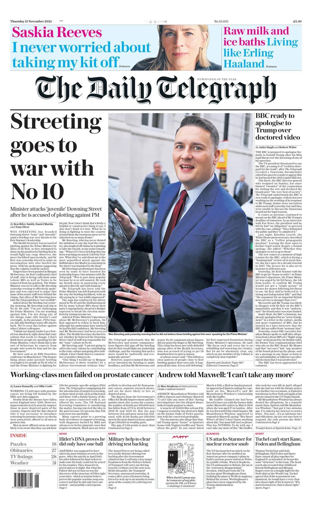 《每日电讯报》称,英国广播公司已准备就1月6日国会骚乱前对美国总统唐纳德·特朗普演讲的剪辑向其道歉。 照片显示,关于英国卫生大臣韦斯·斯特里廷是否可能准备接替首相基尔·斯塔默爵士职位的传闻甚嚣尘上。