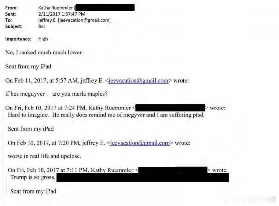 新释出的邮件里,2017 年 2 月,爱泼斯坦与奥巴马时期的白宫副法律顾问凯茜·鲁姆勒聊到特朗普,两人毫不掩饰厌恶。 鲁姆勒先写:“特朗普真恶心。” 爱泼斯坦回:“真人凑近看,更糟。” 这位后来升任高盛首席法务的鲁姆勒,此前已被披露卸任后多次进出爱泼斯坦的私家联排别墅。