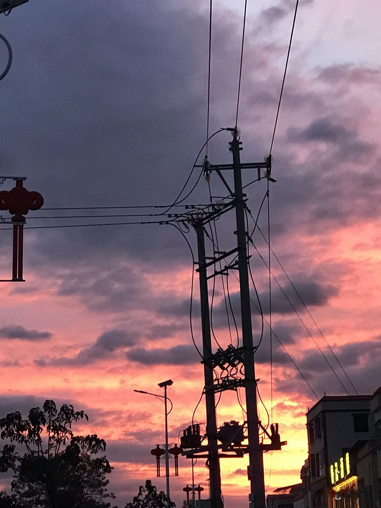电线杆子的黑影子戳在橘色云堆里,连旁边挂的中国结都变温柔了。凉风轻拂,路灯温暖,