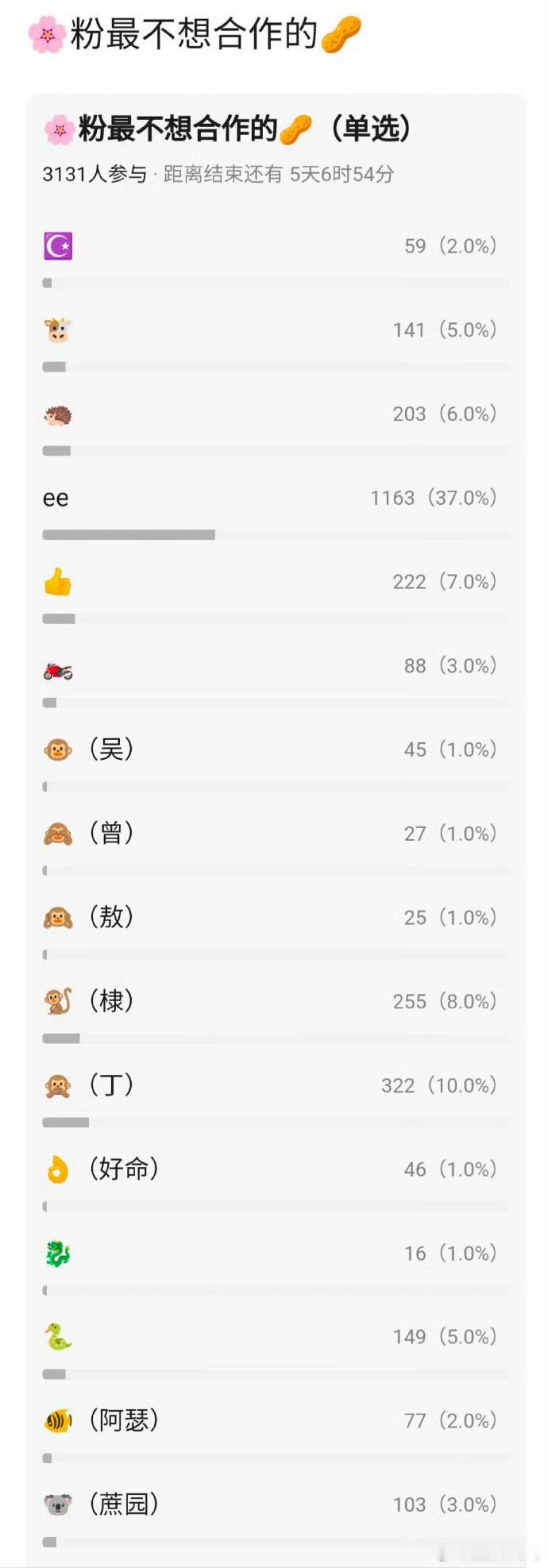 这里面哪怕是觉得很糊的来合作也要平番在前,再红一点的还要一番回车 ,恕我直言这里面大多都是挑🌸的人,下次投票可以再选糊一点的