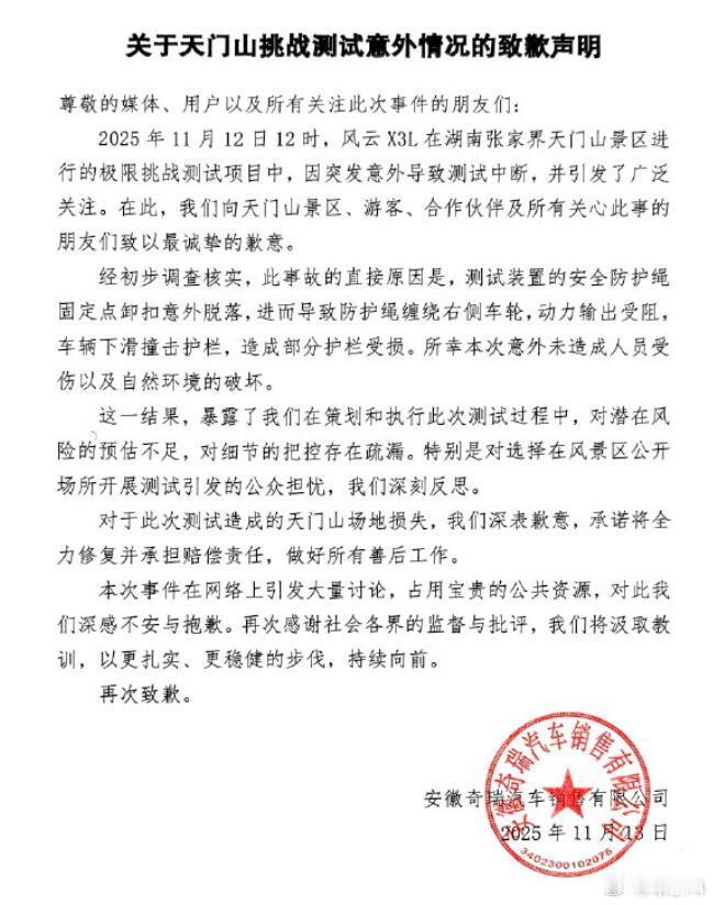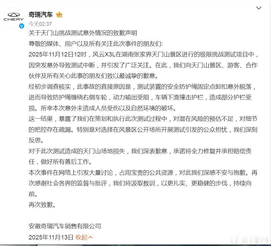 从视频来看,应该是技术问题,主要是安全绳出了bug,真是意料之外。而且好像车子用的并不是大齿胎,抓地力估计不足,再加上台阶湿滑,一系列因素导致了这个结果。我觉得,这事儿本身没什么可吐槽的,只是车企秀肌肉的一次失误,无可厚非。至于有些人说奇瑞“博眼球”、“无下限”,我们是不同意的。路虎都可以在天门山极限挑战,“砖叔”Ken Block都能在天门山漂移,红牛也有自行车速降和翼装飞行挑战,怎么奇瑞就不行了?可能准备不足是个问题,但都是可以改进的。
