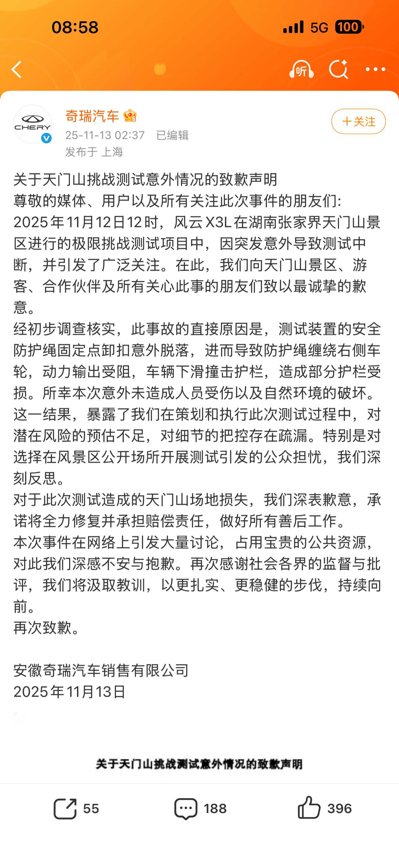 昨天各大汽车群疯传的,天门山爬坡失控事故,车型是奇瑞的风云X3L。奇瑞深夜做出了