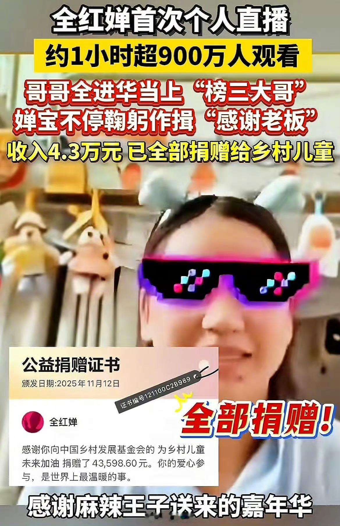 小小年纪却不贪财,直播的收入全部给捐给了“曾经的自己”,她值得成为所有的榜样。 全红婵成年后第一次跟师兄师姐连线直播,因为不知道怎么关打赏,粉丝一直刷礼物,把她吓到了! 昨晚进直播间时30万人,一会就50几万了,好多刷跑车,火箭,嘉年华的,人气真的好高。婵宝一直在说:谢谢老板,老板们发大财。特别可爱! 她后来把礼物全兑现捐给乡村发展基金会关爱儿童,她正在用她的影响力,走一条值得大家更喜欢的路! 她在社交平台上说的那句话:没有白走的路,对错都是我的脚印。是她作为运动员心态日趋向好的最好诠释,果然国家队这个氛围,出来后基本上都是三观正的孩子。