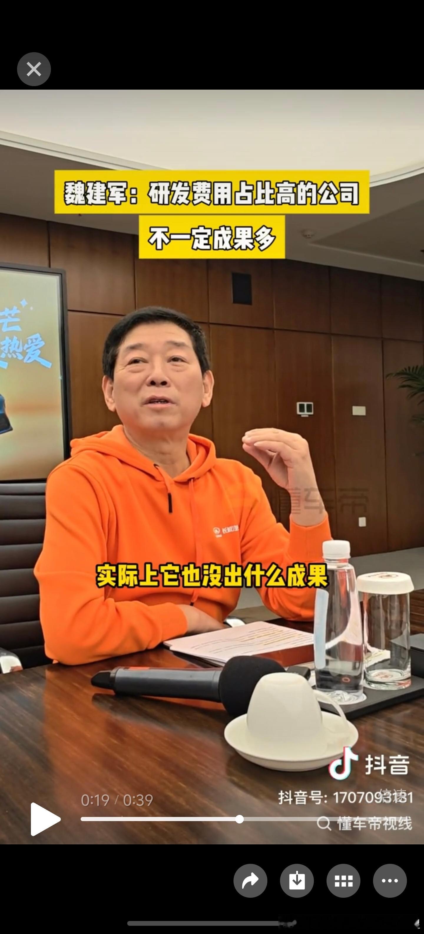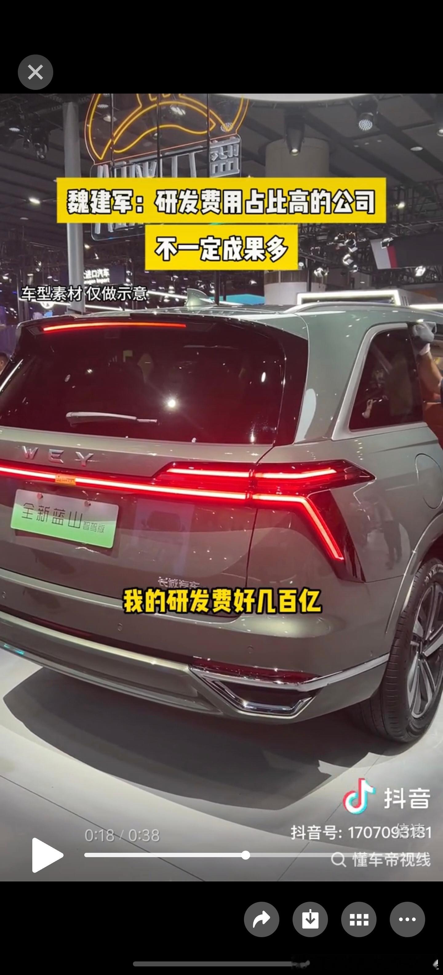 魏建军锐评行业“研发费用占比高 不一定成果多”“人们往往说'我的车企研发费用好几百亿'实际上他也没出什么成果。”“用很低的研发费用作出巨额销售额和利润才是本事。”来自 懂车帝视线的采访魏总往往能在行业进入困境的时候给大家指明方向,西方品牌也不重视研发,但是利润却如此的高,到底是为什么?这一切值得中国每个汽车人反思。