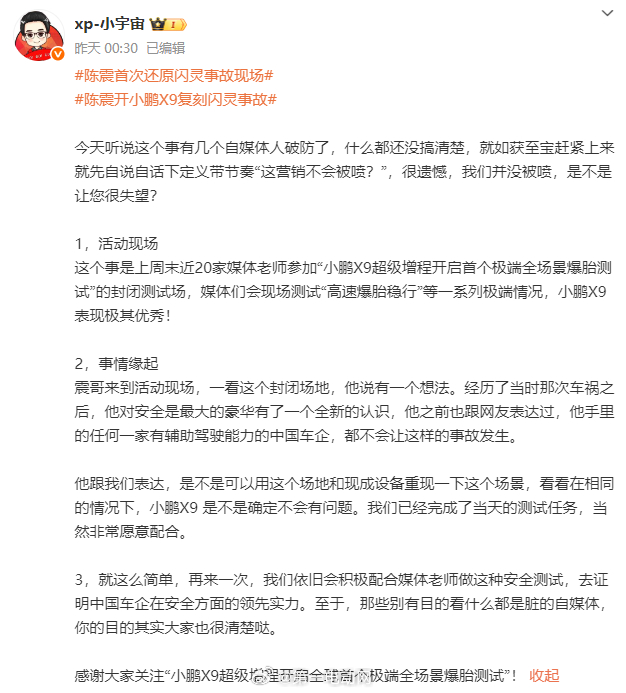车评人陈震近日在封闭测试场驾驶小鹏X9,复刻了此前劳斯莱斯闪灵的事故场景。测试中,小鹏X9在时速80公里和100公里下均成功识别障碍并主动刹停。陈震称“安全才是最大的豪华”,并表示若当时驾驶具备辅助驾驶的中国品牌车,事故或可避免。但也还是引起了一些争议,争议焦点在于:支持方认为:复刻测试能直观验证车辆安全性能,推动行业技术透明化小鹏员工回应,测试是应陈震临时提议,旨在证明中国车企的安全实力反对方认为:复刻事故场景可能对原事故伤者及家属造成二次伤害,缺乏人文关怀被质疑“借悲剧营销”,通过对比豪华品牌凸显自身,稍显不妥在技术验证与伦理边界之间,此类测试是否应设定更明确的规范?如果复刻测试能避免更多事故,但可能触及伦理争议,你支持还是反对?