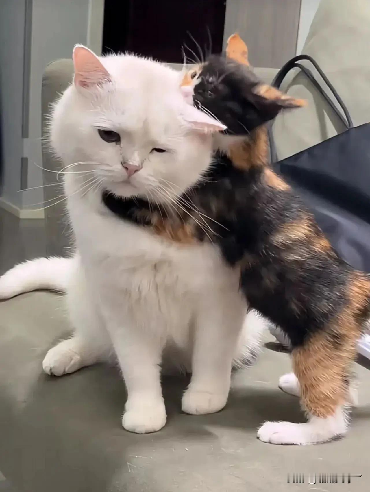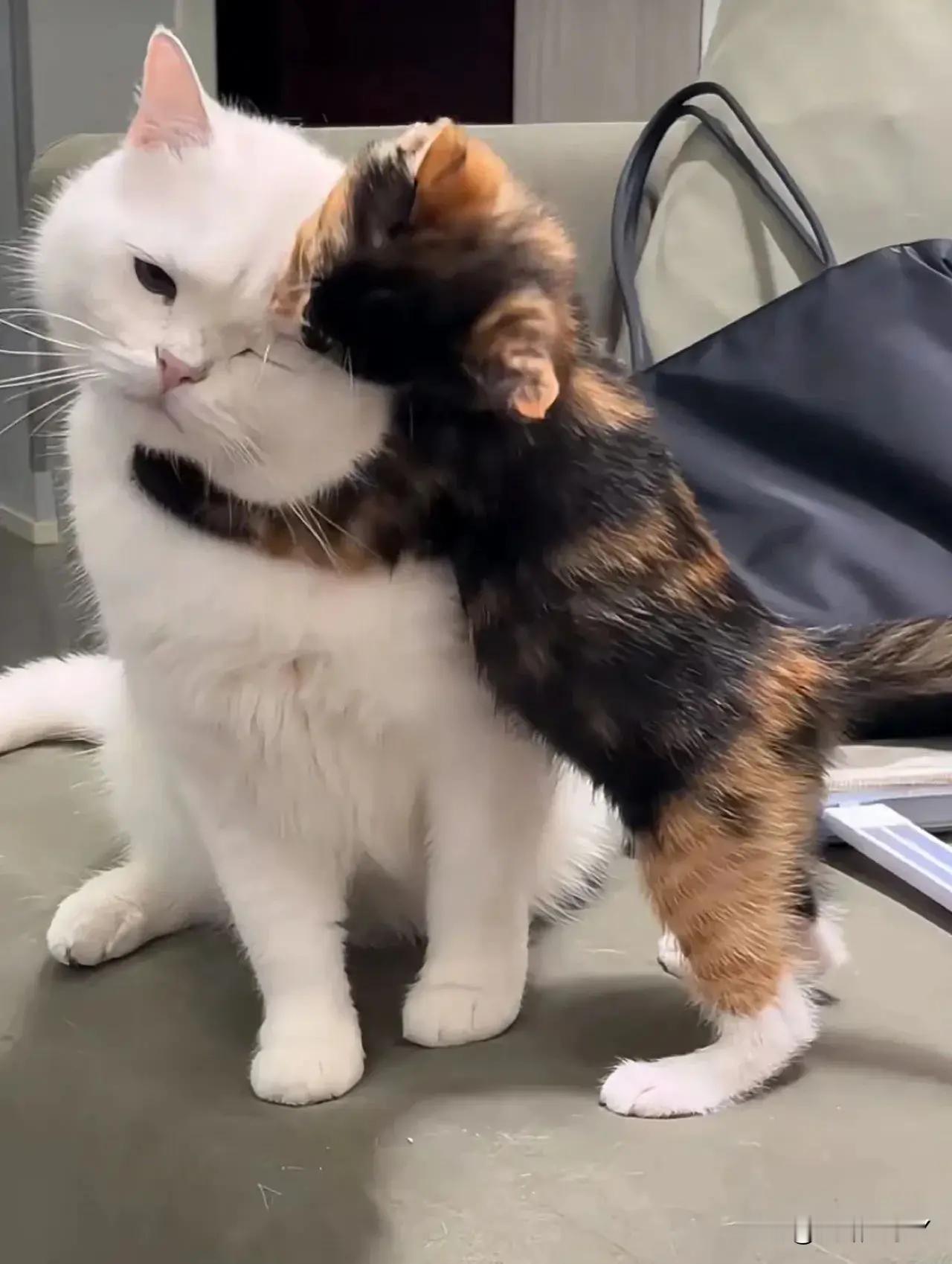 这是一只怀孕的母猫和她的孩子,每到饭点了就领着孩子到处找吃的,每次给她食物都是先