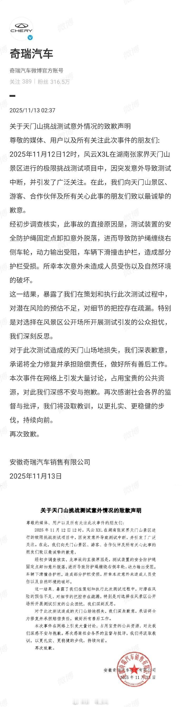 【奇瑞天门山测试失败,官方连夜致歉】 本想秀把爬坡实力,结果奇瑞风云X3L在张家界天门山的999级“天梯”上演了惊险一幕。测试车辆因安全绳卸扣脱落导致溜车,撞坏景区护栏,万幸没有人员受伤。11月12日,奇瑞风云X3L在天门山景区进行极限爬坡测试时发生意外。用于保护的安全绳固定点卸扣意外脱落,绳子缠住车轮导致车辆动力受阻,随即下滑撞上护栏。奇瑞汽车在事发后次日(11月13日)凌晨发布致歉声明,承认对风险预估不足、细节把控存在疏漏,并对选择在风景区公开测试表示深刻反思。承诺将全力修复并赔偿景区损失。