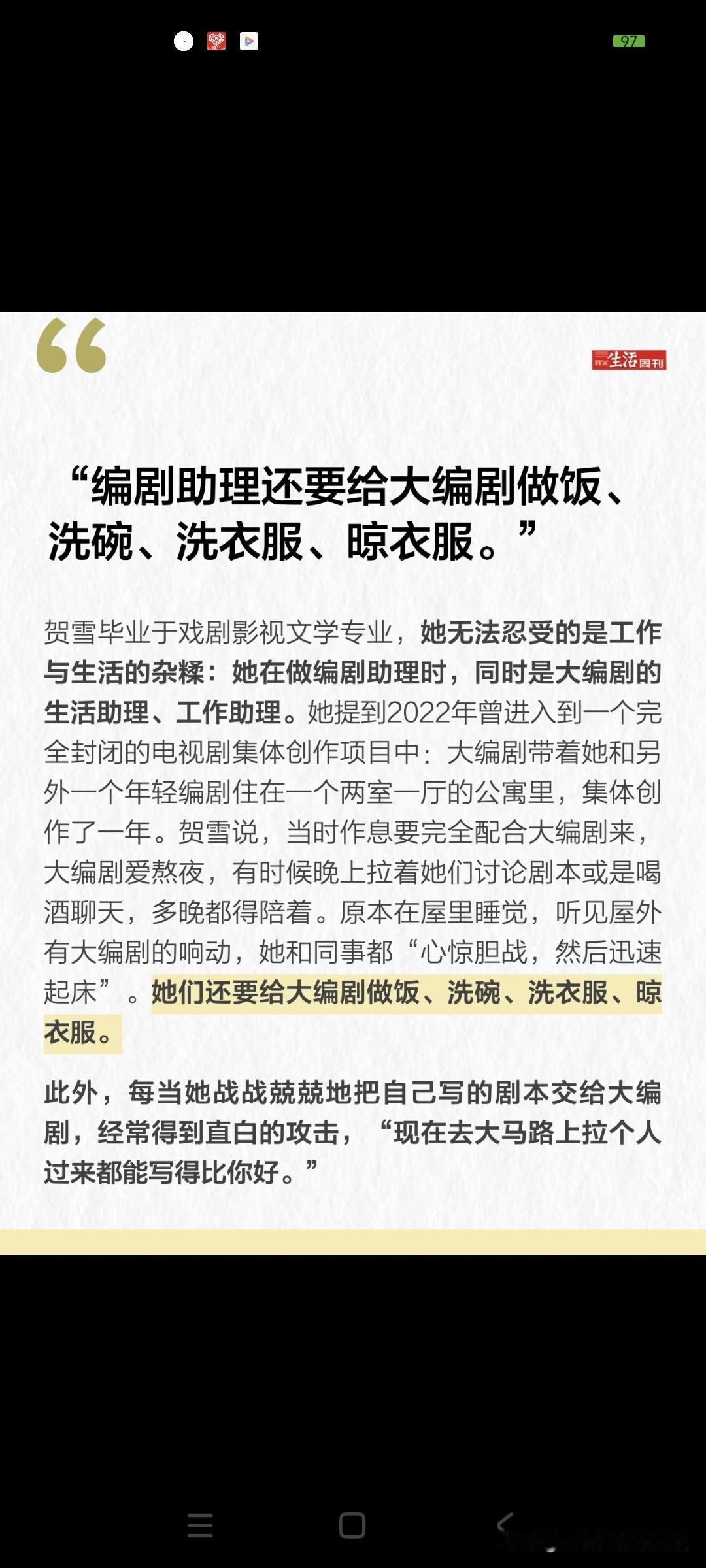 说实话,内娱的小编剧们,真的应该感谢古二的「破釜沉舟」 以前只知道,一些明星红了以后,会变得狂妄,不把工作人员当人看。 古二之后才发现,那些幕后的大佬们,作威作福起来,比明星还狠! 我相信这件事之后,大编剧们/大导演们,对「抢手」们的态度,一定会比之前要好一些。 再给他们做饭/ 洗碗/ 洗衣服,应该会得到一些应有的报酬,最不济也能得到一声「谢谢」 这就是古二的功劳。 编剧古二 创作训练营开营啦