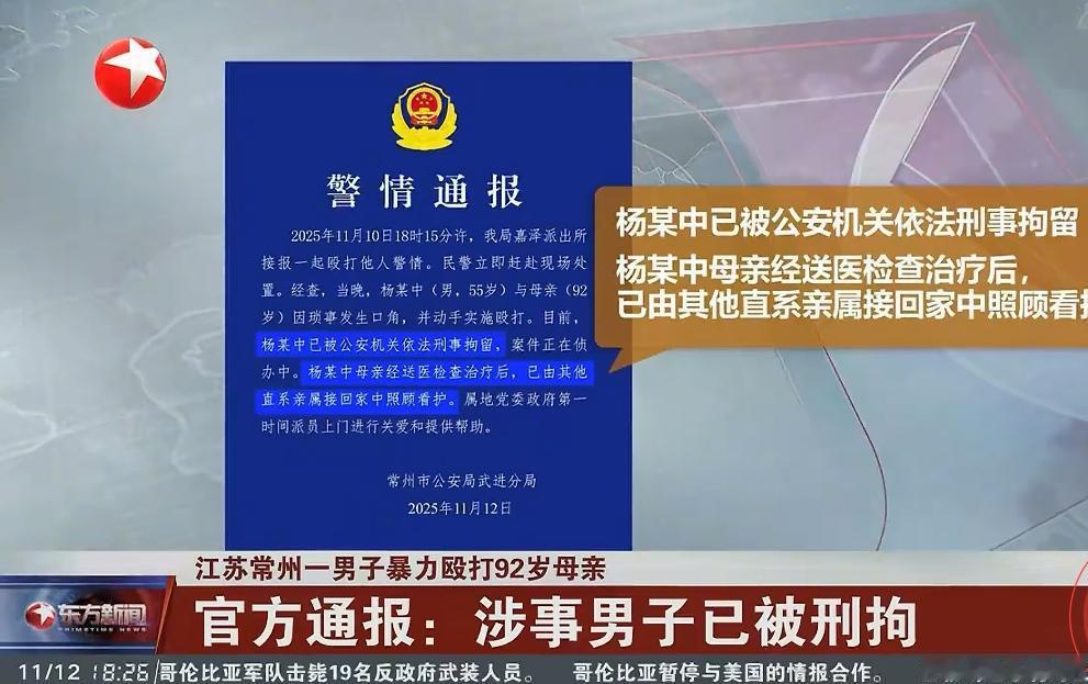 上海东方卫视报道:11月10日,江苏一55岁男子杨某中因生活琐事,与93岁老母亲发生口角,随后杨某中对着老母亲的脸,就是不断地抽耳光和殴打头部,老母亲痛哭流涕,惨叫着逃至厨房,又被其子杨某中揪着头发摁倒在地。这一幕被视频拍下,后有人报警,当地公安随即出警,抓获了杨某中,已被刑事拘留。据律师讲,殴打虐待老人,情节严重造成重伤的,被告人将被判处有期徒刑二至七年,此案,正在进一步审理中。 尊老爱幼,应该是我中华民族优良传统,如此对老母亲大打出手,实属不该!大家觉得呢?