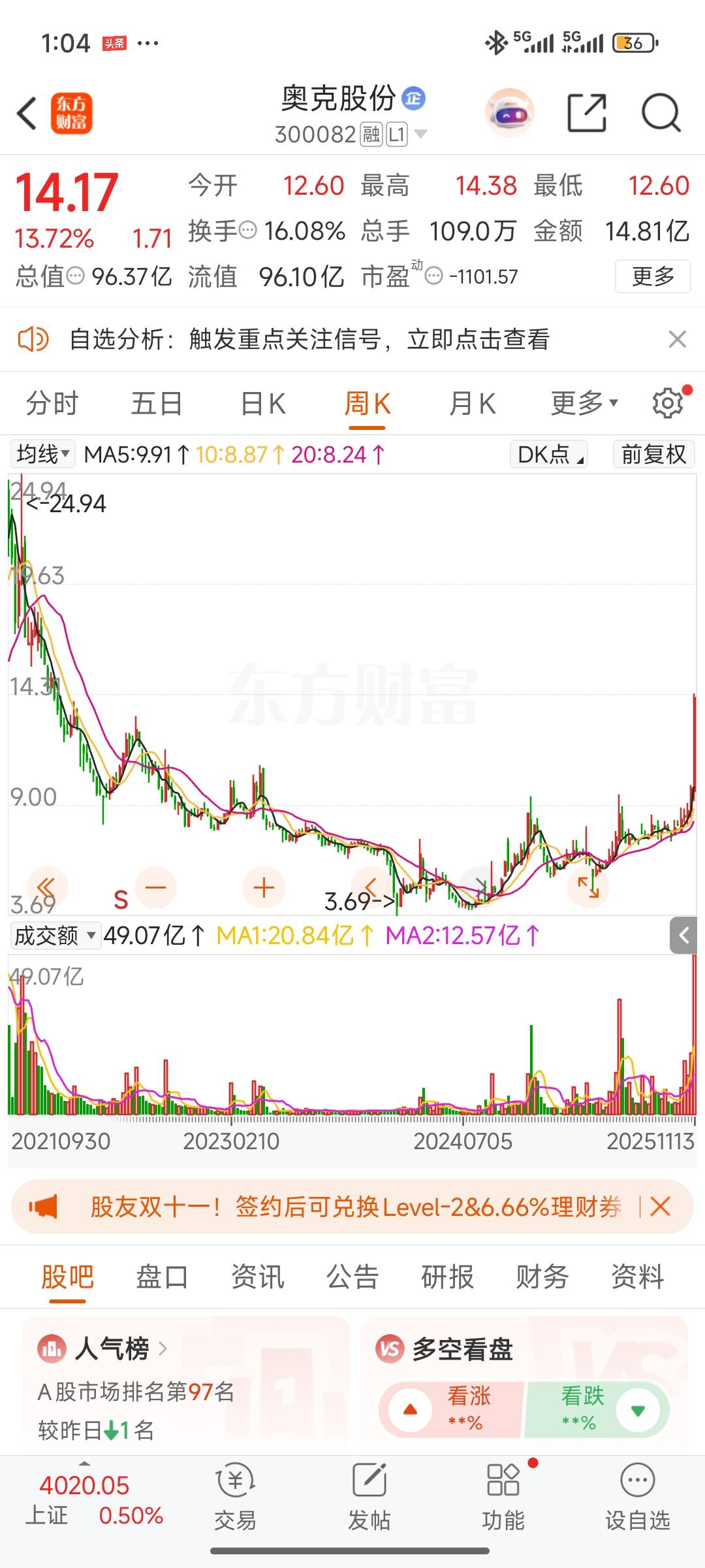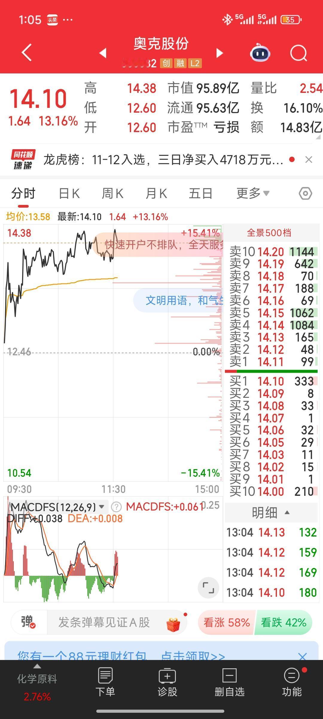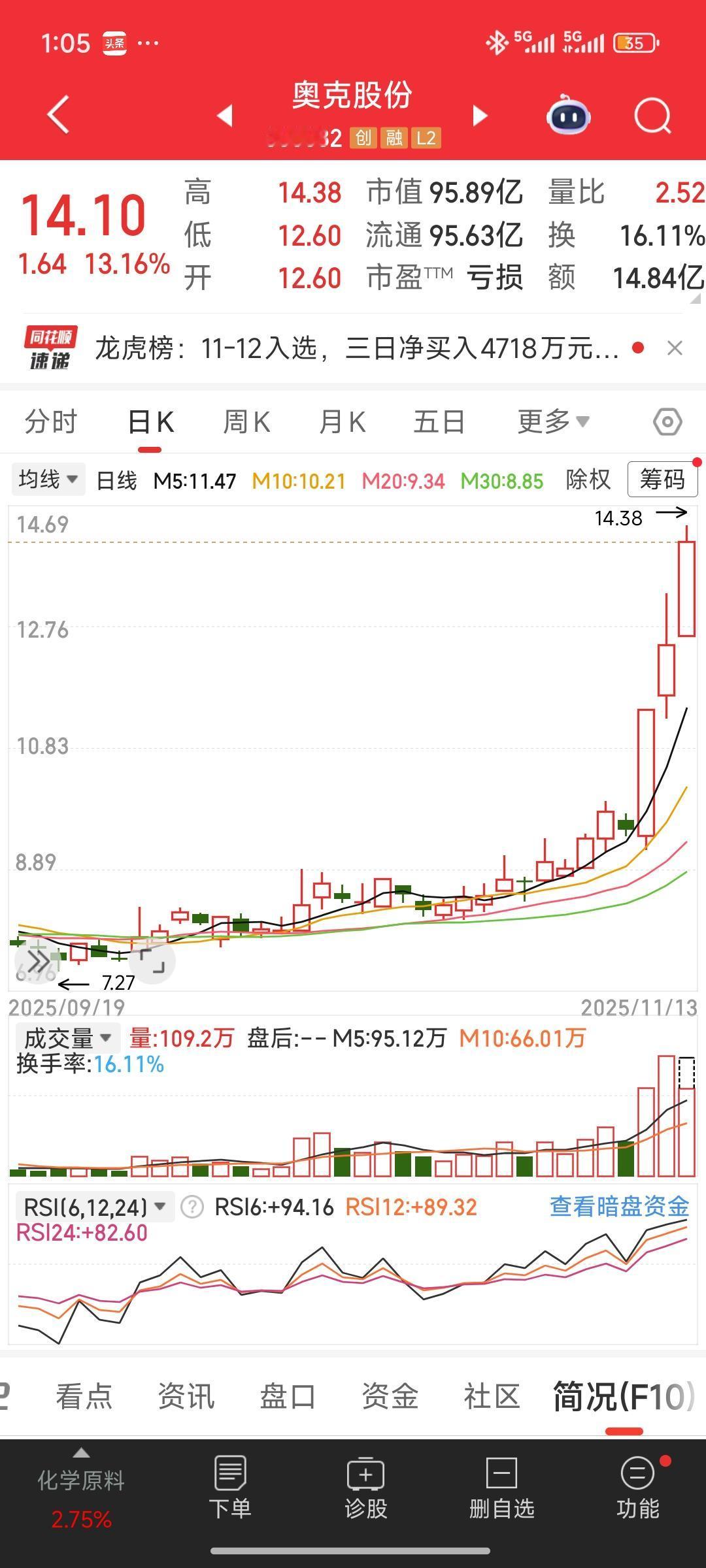 奥克股份今日再度大幅上涨,喜迎三连阳。短线涨幅已超 50%-60%,已然达到我的首个目标位,此时可考虑减仓。虽说第二个目标位是 20,但或许需调整几日方能达成。在此恭喜跟上操作的股友们,也恭喜一直持有的股友们。 奥克股份 股票财经