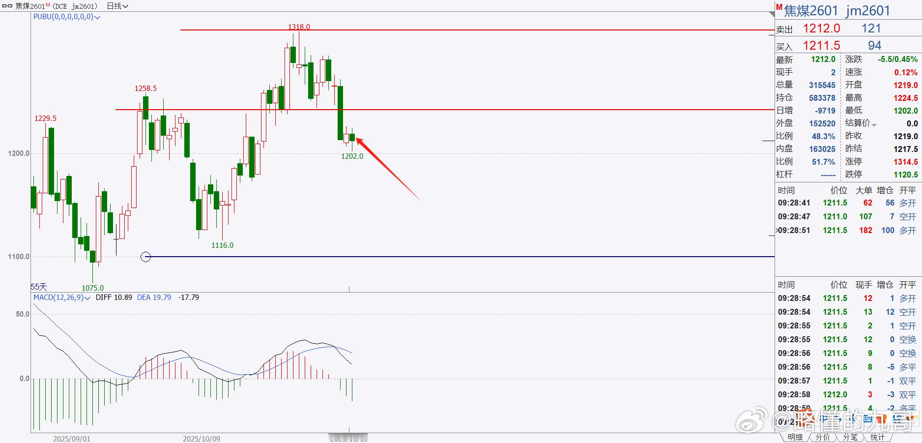 焦煤继续短期低位运行,要注意今天这根线,如果收长下影线,有可能去反弹冲击1240,但是短期回调,长期多头的局面没有改变,依然维持此观点!