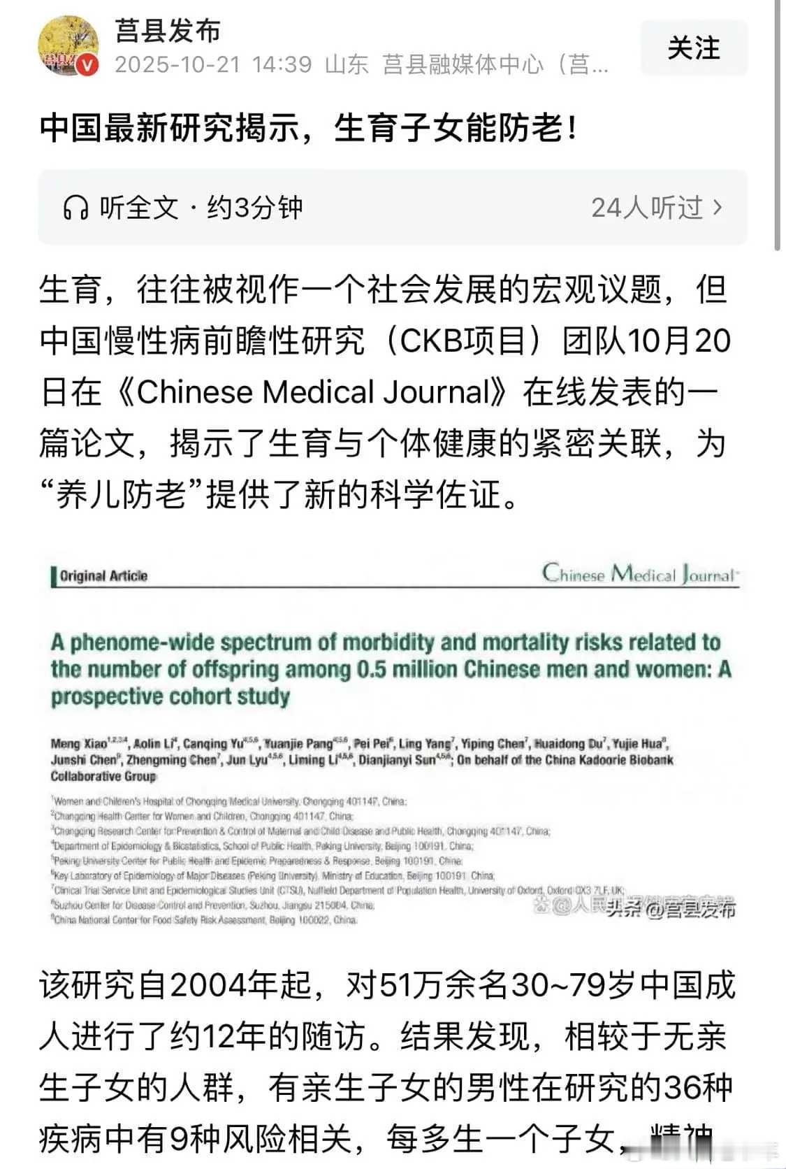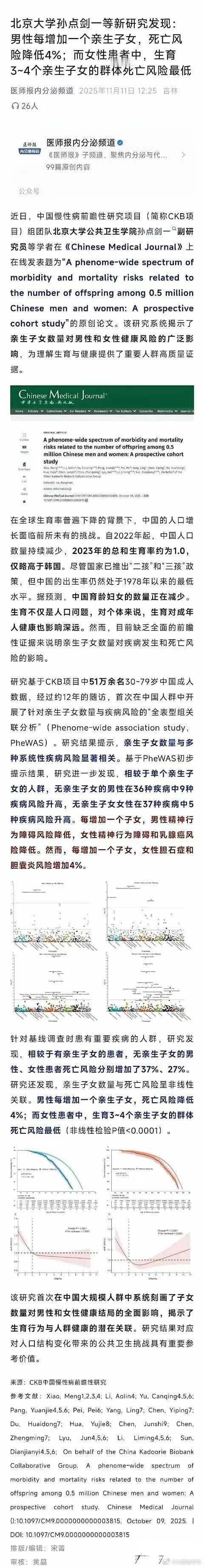 震惊!北大研究发现, ,男性每增加一个亲生子女,死亡风险降低4%。北京大学孙点剑一等新研究发现:男性每增加一个亲生子女,死亡风险降低4%;而女性患者中,生育3~4个亲生子女的群体死亡风险最低。