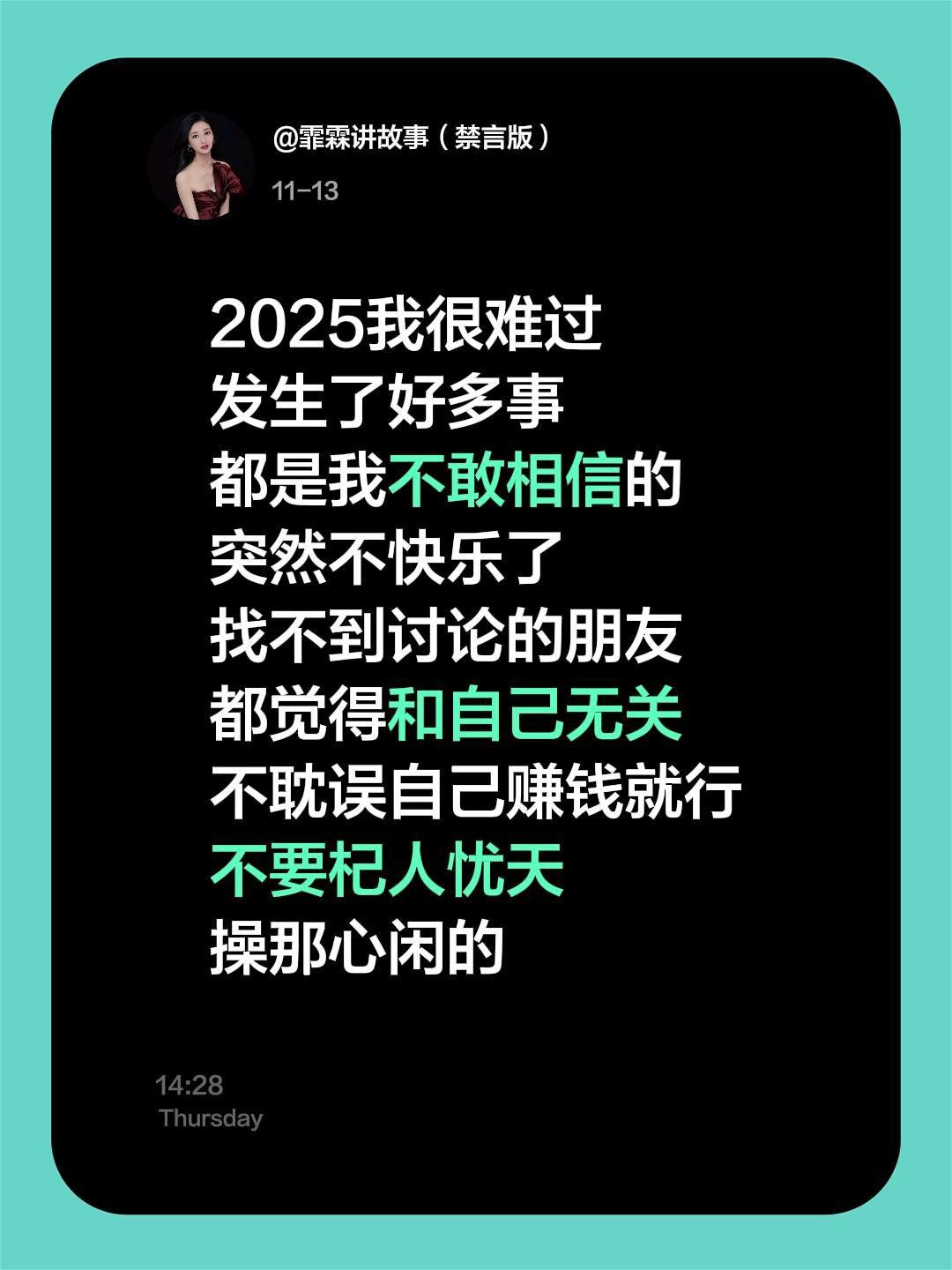 2025我很难过 发生了好多事 都是我不敢相信的 突然不快乐了 找不到讨论的朋友 都觉得和自己无关 不耽误自己赚钱就行 不要杞人忧天 操那心闲的