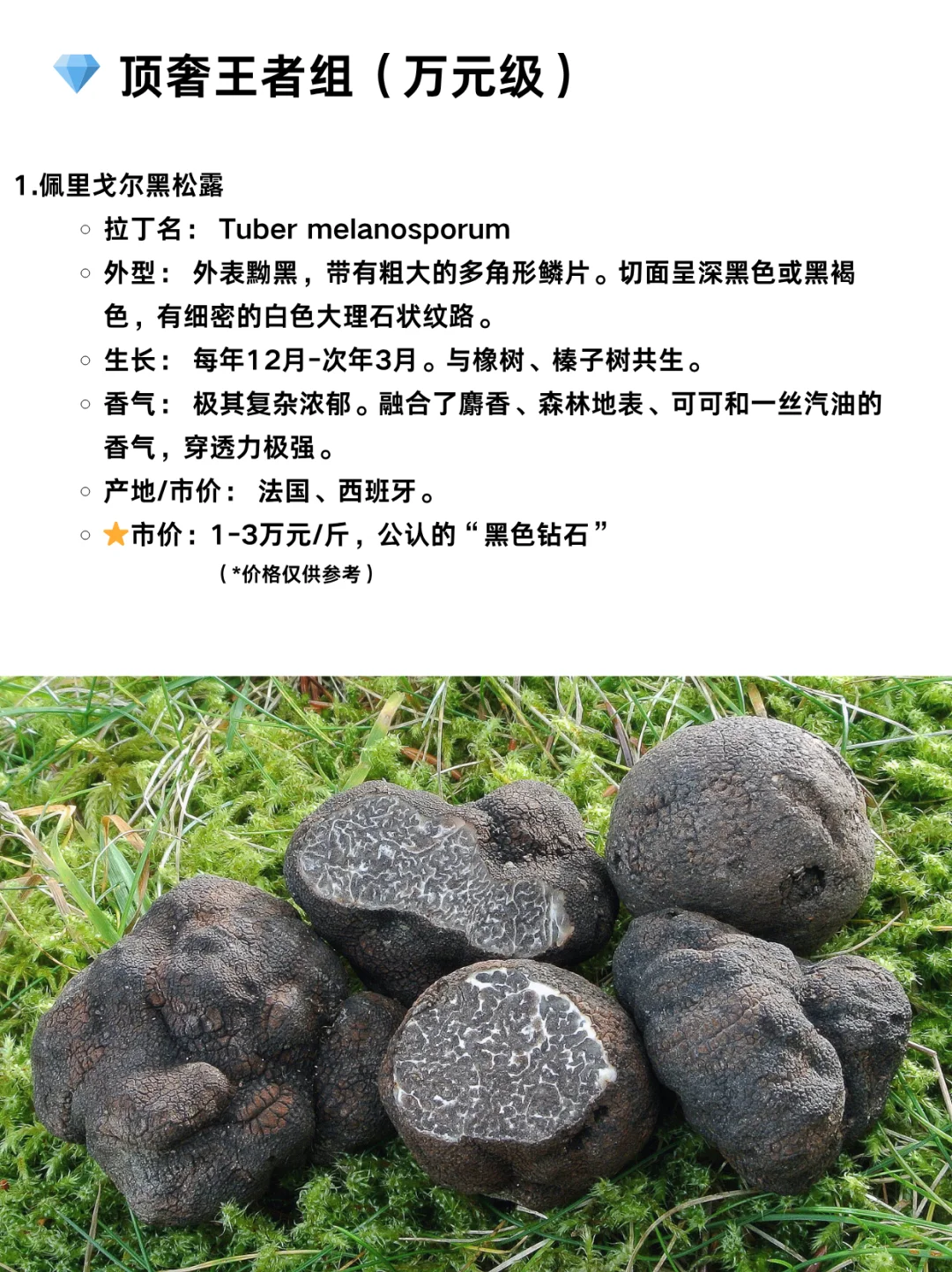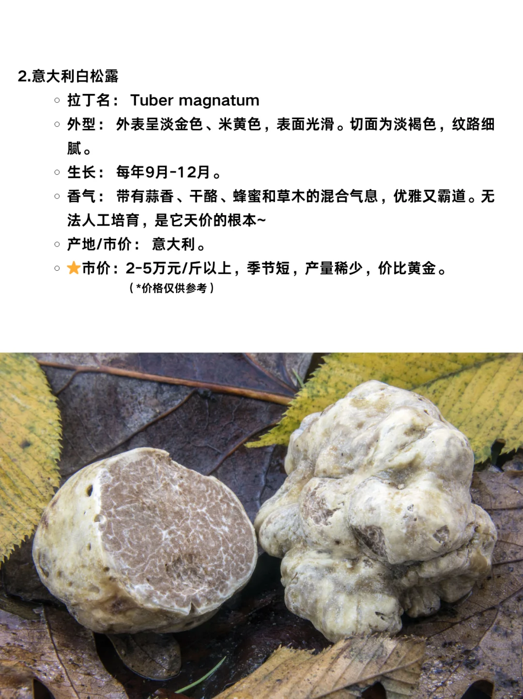 产地/市价: 意大利。⭐市价:2-5万元/斤以上,季节短,产量稀少,价比黄金。