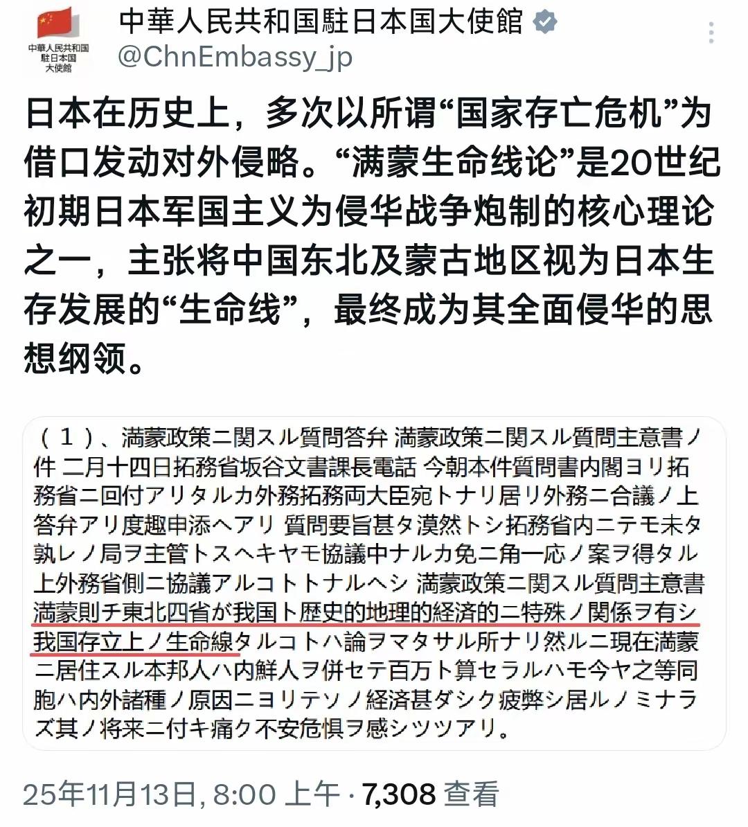 11月13号,今天中国驻日本大使馆再次发文,和前两天相比,这一次更是直接追到了高市早苗“存立危机事态”的根源上去,那就是近代日本对外扩张的三线理论,就是主权线、利益线和生命线。 驻日使馆这次把“生命线”讲得特别清楚,说白了,这就是日本老一套的侵略思路。早在百年前,他们就把满蒙当作“生命线”,陆上要扩张,海上看东南亚和太平洋岛屿,这种想法直接埋下了二战的祸根。高市提出的“存立危机事态”,其实就是把老思路搬到现代,把台湾摆在了“必争”的位置。 细看三线理论的发展,其实是一条延伸的链条。起初只有主权线和利益线,说白了就是本土和朝鲜半岛,这还能理解。到后来,有了生命线,范围就大了,野心也大了。松冈洋右、田中义一、石原莞尔等人把这条线画得越来越远,满蒙、华北、华中,一环扣一环,把整个中国都算进去了。海上的生命线呢?一眼就能看到东南亚和太平洋岛国,那个时候的日本政客可没打算按规矩来。 这次大使馆点名生命线,提醒咱们,不是危言耸听。日本的地缘政治逻辑从没变过,只是包装更新了。说到底,这种思路是动态的,不是静止的。你让它不受阻,它就一点点扩张,不仅是版图,还是影响力、话语权。历史上的教训已经摆在眼前,再清楚不过了。 看现在,日本又把台湾拉进他们的“安全算计”,就是新瓶装旧酒。面对这种情况,躲不开,也躲不了。不能跟自己骗自己,以为过去的战争已经清算干净,其实那些战犯理论、那套侵略逻辑,在日本政界、学界、舆论场里,还存在着影响力。眼下不反击,不表态,等于默认了。 讲白了,咱们不能只靠嘴上说说,要用实际行动表明态度,别给对方任何幻想。历史不是教科书里的故事,而是现实的镜子。日本如果野心膨胀,是看得到的,也是可以预判的。高市的表态,就是提醒大家,他们的逻辑还在运转,而且和当年没差多少。 很多人可能觉得,这离自己太远,台海、东亚,好像风平浪静,其实不然。地缘政治的每一次动作,都可能影响到区域安全和国家利益。保持警惕、看清套路,是咱们必须做的功课。比起被动应对,提前认清动向、形成联动,这才是对历史的尊重,也是对未来的负责。 总结一句话,日本的生命线思维不是过去式,而是延续到今天的现实版。如果咱们不警觉,不回应,他们的“存立危机”逻辑可能就会像病毒一样,慢慢侵入更广的区域。应对它,既是捍卫国家利益,也是对历史的交代。咱们要让对方明白,今天的世界,历史的教训不能被忽视,也不会被轻易重复。