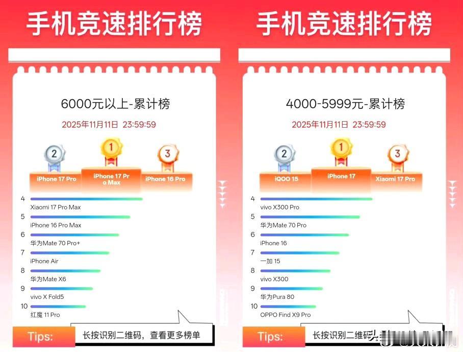 双十一期间高端旗舰销量排行[思考]两个价位段第一都是iPhone17系列[我想静静]一个是Promax,一个是标准版,苹果到了双十一还是太强了,国产旗舰也有不少新发布的,X300系列全系上榜,但是销量不及iQOO15[笑哭]子系旗舰机销量超过母系!X9系列标准版没上榜