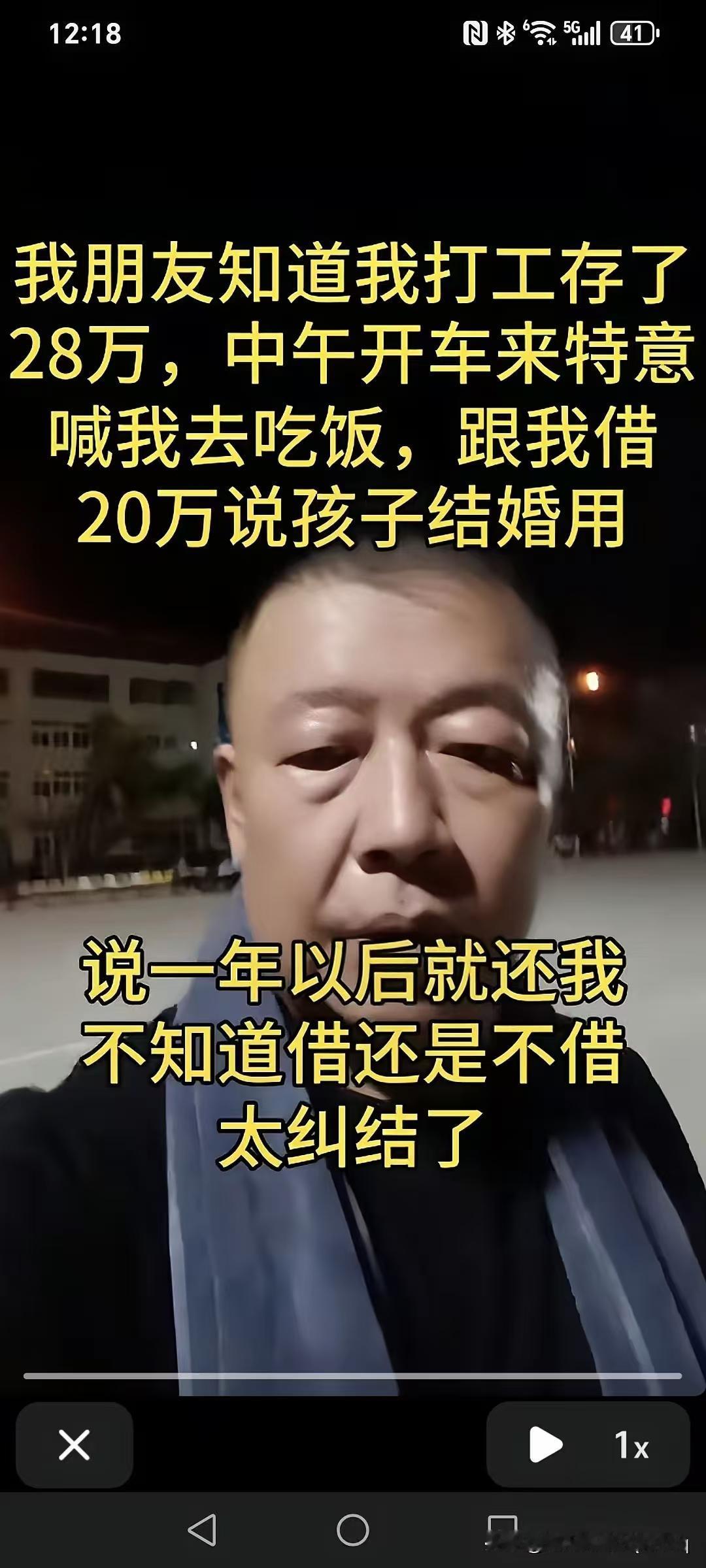 我朋友知道我打工存了28万,中午特意开车来喊我吃饭,跟我借20万说孩子结婚用。一年后能还的,根本就不需要借,除非你有抵压物业。 如果一年后他还得起20万,现在他根本就不必要借钱。 打死都不借,不要考验人性的恶,借出去的是钱,讨不完的是债!到时候不要说朋友没有了,还可能找来个仇人! 孩子结婚借钱,两个人是朋友,借也为难,不借也为难 那就给他2万,白给不要了,告诉他我给2万,我就是不借给。 这是鸿门宴,这一顿饭有可能就吃掉了28元,而且还多了一个仇人,任何时候都不能让别人知道你存了多少钱。