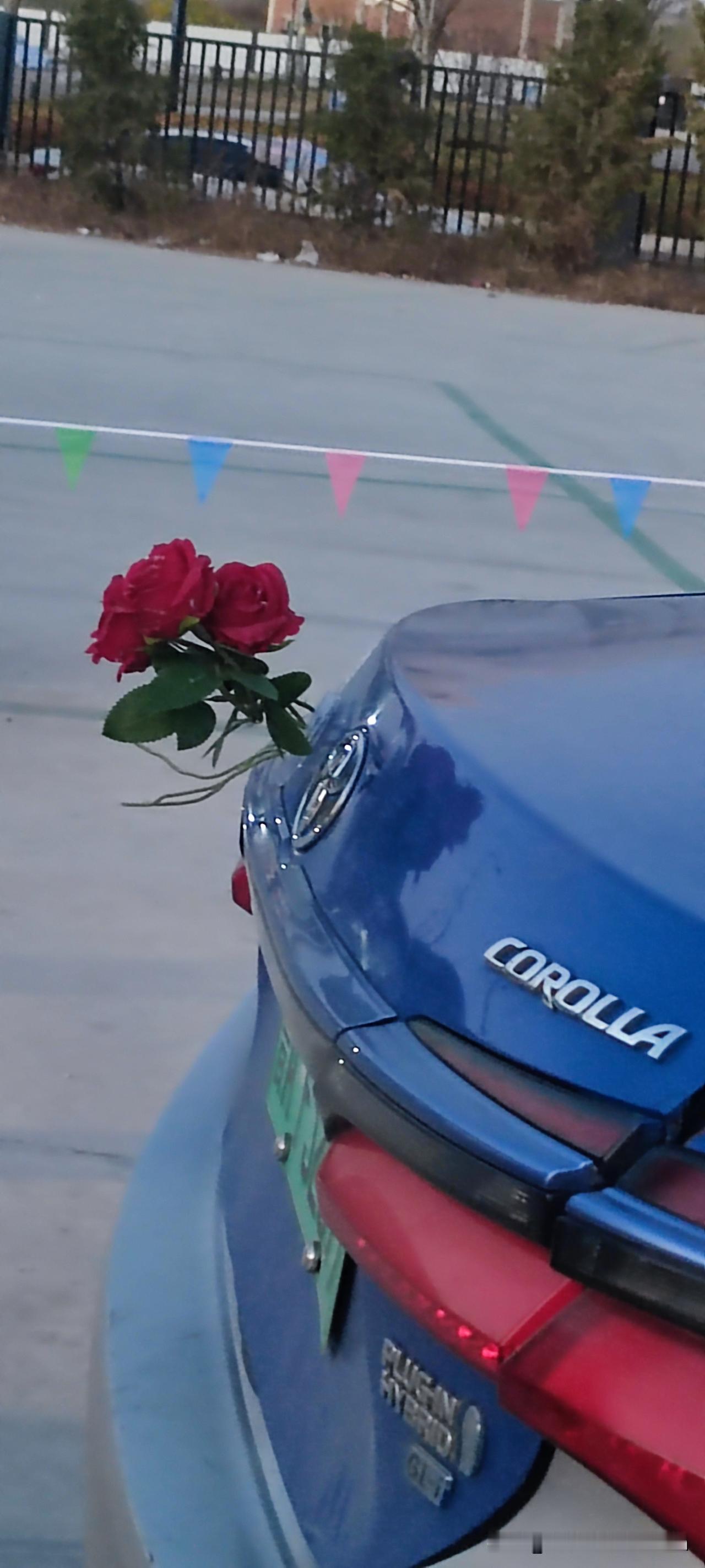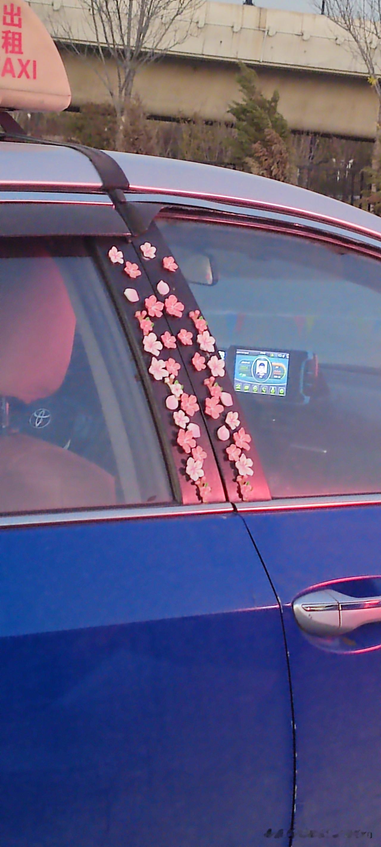 一辆有特点的出租车, 门子上贴着小花, 后尾部插着玫瑰。 这应该是一位热爱生活的的哥。