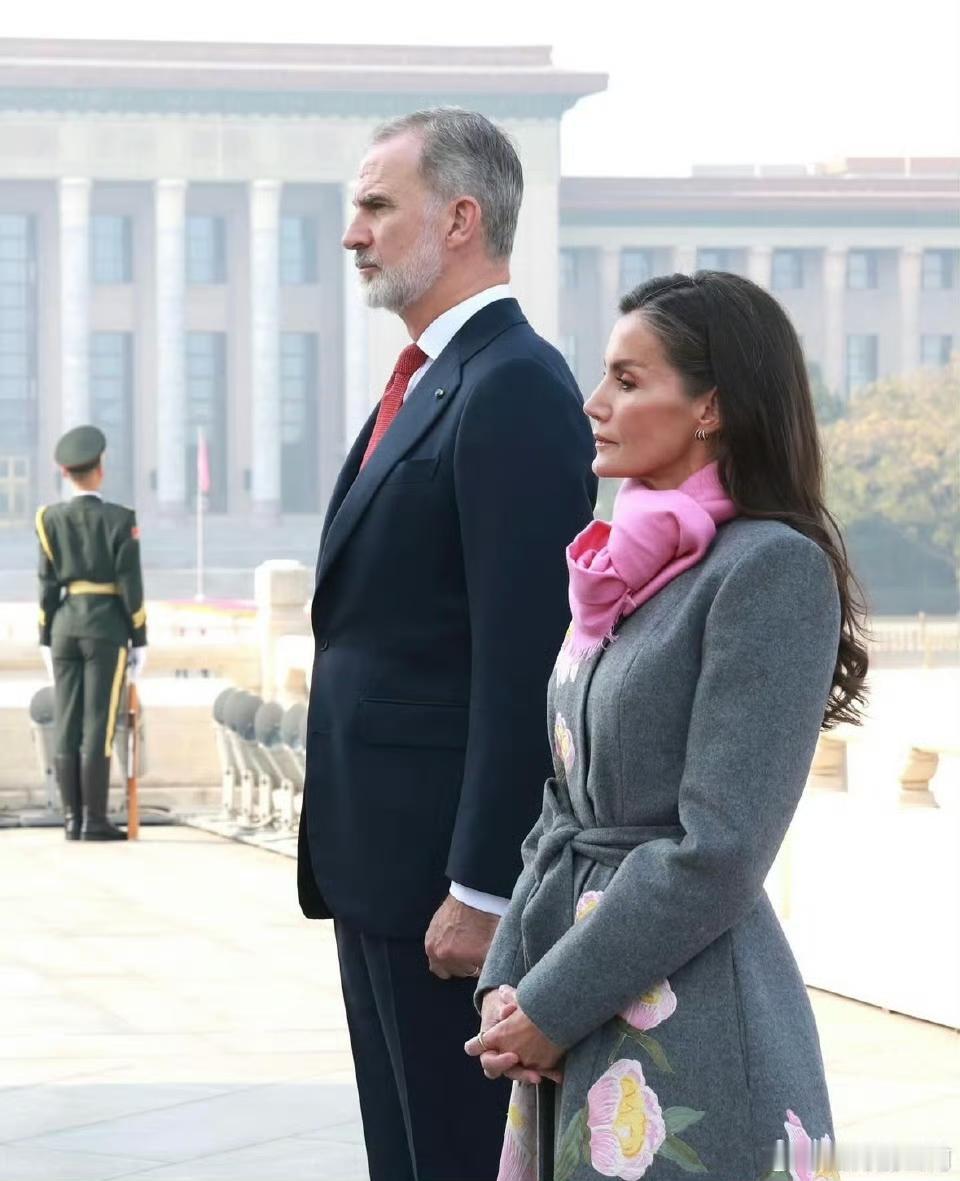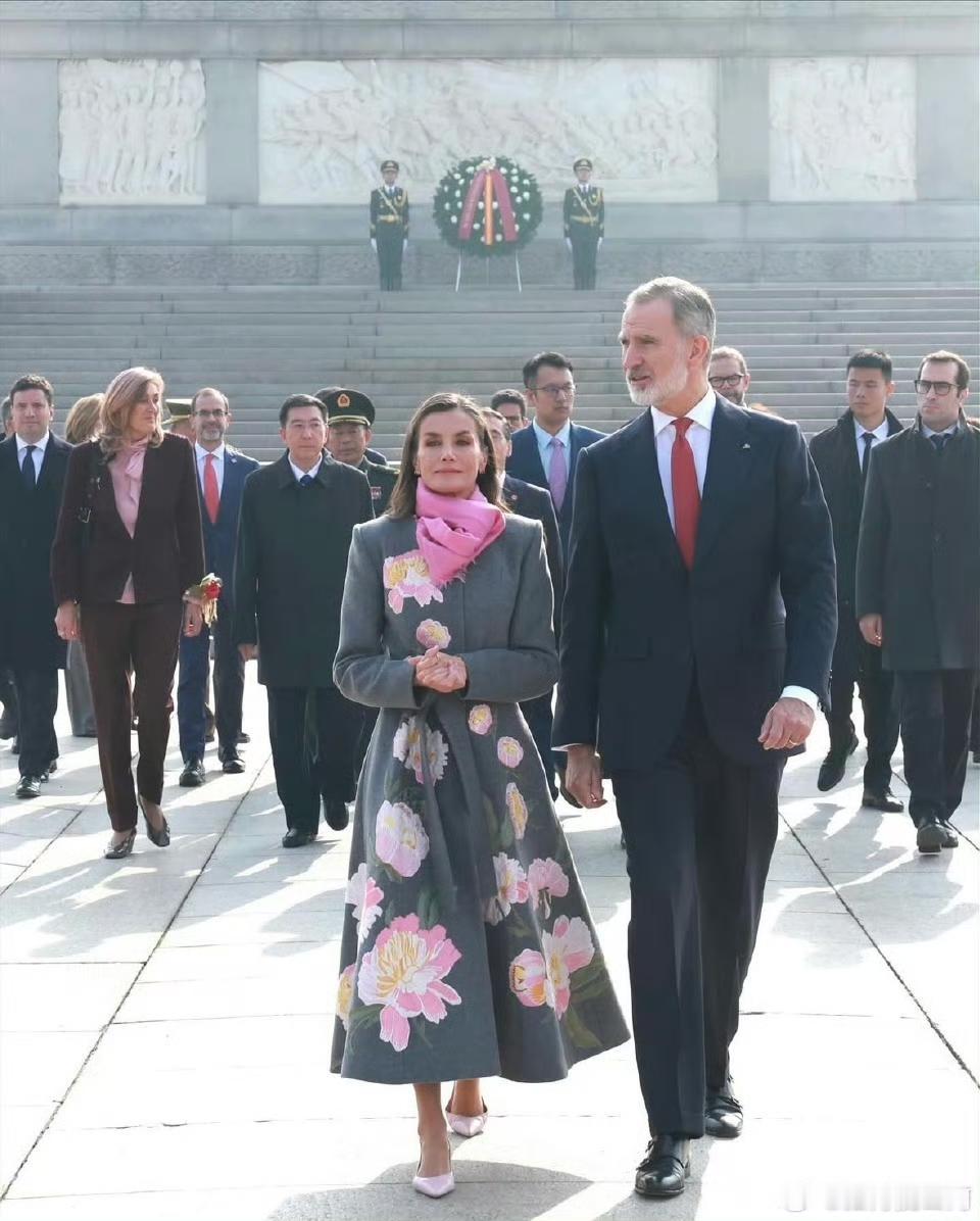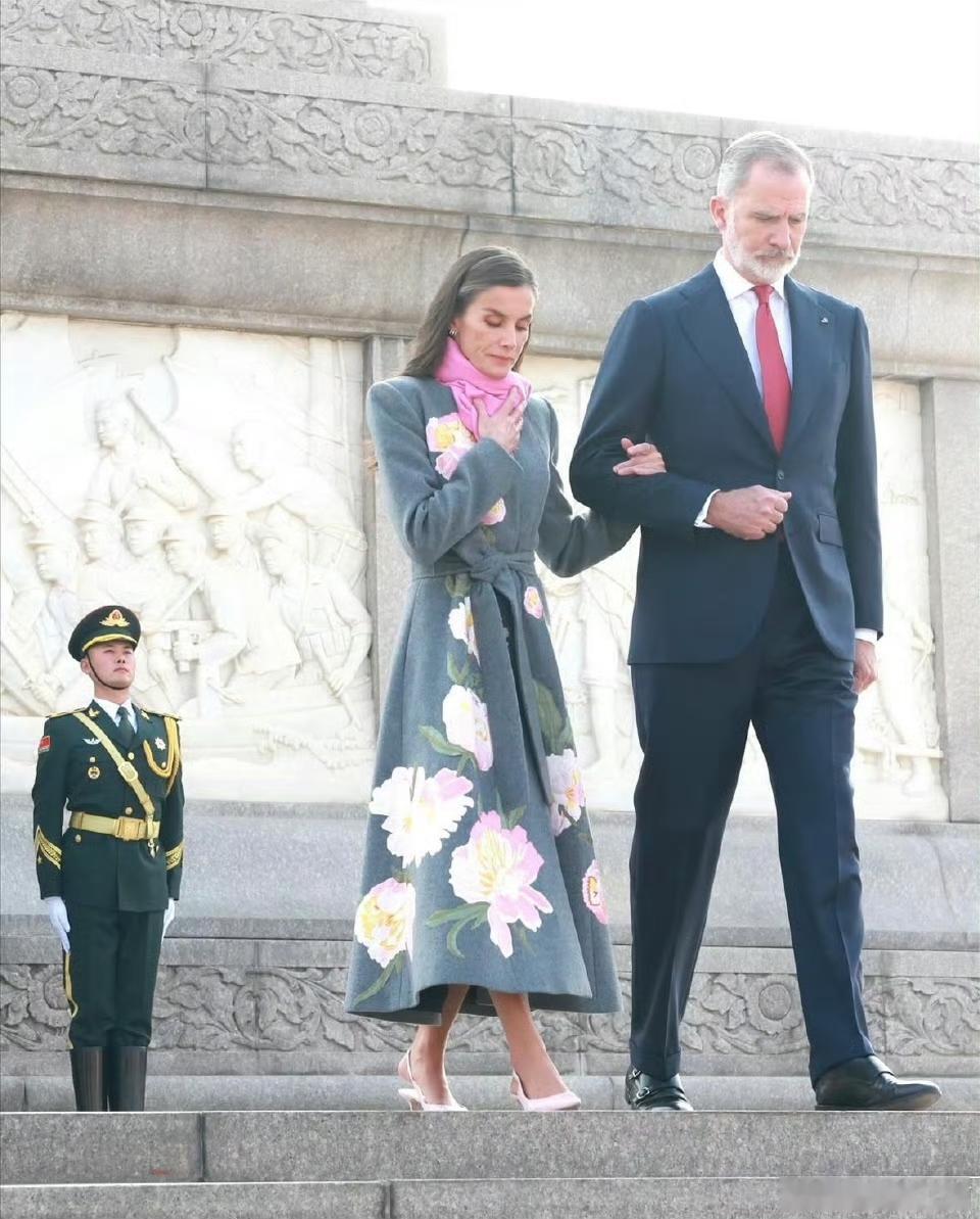 来自西班牙的客人,王妃造型很惊艳,粉色围巾,灰色长大衣,点缀图案颇具中国元素,下面光着腿,真是“美丽冻人”[狗头]