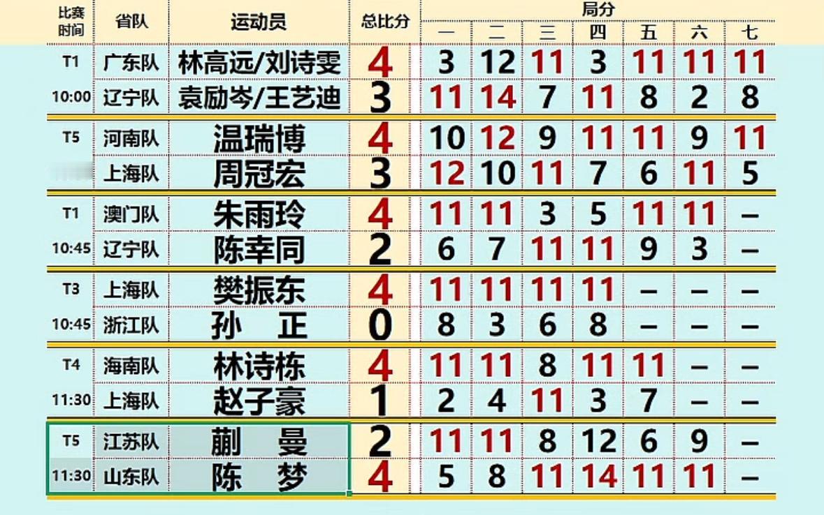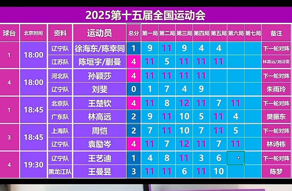 女单四强 孙颖莎VS朱雨玲 王曼昱VS陈梦 奥运组合,外加一个朱雨玲! 总说不给小将机会, 这次全运会各省的精英 小将全部出动, 打来打去, 还是去年巴黎奥运会的 三人组, 外加一个朱雨玲! 这说明什么, 孙颖莎,王曼昱, 陈梦,还处于巅峰期, 全运会期待的黑马并没有出现, 男单四强: 王楚钦VS樊振东 林诗栋VS袁励岑, 奥运组合却一个马龙, 因为龙队没有参加单打, 期望的梯队建设也没有出现, 本以为陈俊菘能闯出来, 没想到2:4袁励岑啦…… 期待明天的半决赛吧, 加油国乒!