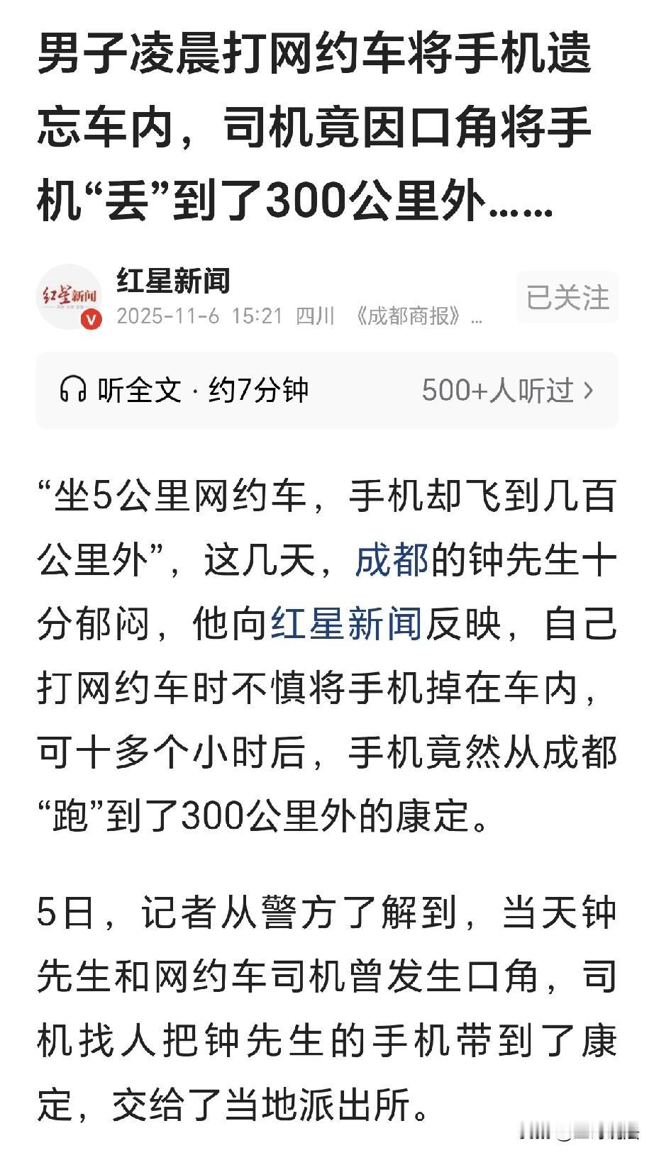 四川成都,一男子坐网约车,随手将手机连到中控台上充电,谁知他下车之后,突然发现忘记拿手机,他立刻联系司机,可无人接听电话,他又联系平台,可是等到第二天还没回音,男子急了,直接到派出所报案,谁知警方一查,发现手机在300公里之外,警方联系到了司机,司机说出原因,令人大跌眼镜! 钟先生为了方便,平时用了两部手机,他出门在外,俩手机寸步不离。 其中一部手机,绑定着他的个人医保,还有公司财务工资卡,这手机非常重要,被他紧紧的握在手里。 11月2号这天,钟先生一直忙到凌晨,外面天早已黑,他一看表,已经是凌晨2点左右。 他揣着两部手机,急匆匆打了个网约车,这会他只想赶紧回家休息。 不大一会,网约车到了跟前,钟先生立刻上车,突然发现他的手机快没电了。 他立刻把手机连接到了车内中控台充电口上,手机电量哗哗往上涨着,钟先生这才放下了心。 此时此刻,离钟先生家里还有5公里距离,钟先生有点累了,他有些恍惚,盼着车辆赶快开到小区。 不大一会,到了目的地,车子停下,钟先生下车,他头也不回,急匆匆往家走去。 他走着走着,手突然觉得少了点什么,他一拍脑袋,坏事了,手机落车上了! 他赶紧拿出另一部手机,想和司机联系,可是他发现,网约车订单已经结束了。 平台显示的是虚拟号码,他根本无法联系司机。 钟先生越想越急,立刻联系到了平台客服,希望客服能及时回应,帮助他早点将事情处理。 手机本身并不值什么大钱,可是手机绑定着医保,还有给公司发工资的卡,如果要是丢失,那就麻烦大了。 钟先生站在楼下,他的心里越想越怕,这手机要是被人拿到后胡乱操作,万一出了问题,后续十分的麻烦。 他心里煎熬,盼着平台赶快回复,谁知等到中午12点多,平台依旧没有消息。 钟先生越想越怕,一溜烟跑到了金牛区金泉派出所里。 他把情况向警方说明,警方根据车牌号码,很快就联系到了开车的司机。 电话接通,警方立刻询问了司机: 钟先生的手机现在在哪里? 谁知司机回复,手机现在在甘孜康定新城派出所里! 民警惊呆,康定离这里300公里! 钟先生更是蒙圈,我没去过康定,我的手机怎么可能跑到了那里? 民警要他不要着急,即刻联系到了康定新城派出所里,对方工作人员回复,上午11点左右,派出所保安的确收到了一部手机。 根据对方的描述,手机符合钟先生的手机特征,也就是说,钟先生是中午12点报案。 而他的手机,早在11点时就被送到了300公里外的康定新城区派出所里。 钟先生百思不得其解,自己乘车时并没有得罪司机,司机为何这样的做法,难道他要报复自己? 钟先生努力回忆,始终不知道自己错在哪里,他在车上,还和司机聊的挺好。 可万万没有想到,司机竟然这样折腾他的手机。 但是手机已经找到,钟先生的心就搁在了肚子里,他安心等待,新城派出所把手机给他寄了回来。 事后,钟先生心里堵着,他想知道,司机为何要这样为难他。 随后,记者从警方了解到了原因,司机之所以这么做,果然就是报复钟先生。 钟先生表示,他发现手机丢失之后,曾经拨通过司机的电话。 当时司机掉头离去,可他仅仅距离钟先生只有500米,钟先生要求他掉头把手机送回来,自己可以给他二三十元感谢费。 谁知司机告诉他说,系统已经又给他派了单,他已经无法调转,还说他对这段路并不熟悉。 钟先生心里着急,明明送回来就可以再挣二三十元,这个生意对司机来说,十分的划算,为何他偏偏不愿意送回来那? 钟先生心想,难道司机嫌感谢费给的太少?他立刻问到: 你想要多少钱你直接说! 谁知司机并不是这个意思,他也只是个倔脾气,他听钟先生这样说他,立刻心里生起了闷气。 他挂断了电话,拜拖别人把手机带到了300公里外的康定派出所里,他就是为了报复钟先生,嫌他要求自己立刻掉头送还手机! 记者联系到了平台,平台做出回应,司机将钟先生送到之后,的确是接到了另一个订单。 当他接到钟先生电话时,正在接乘客的路上,并不是司机故意不归还手机。 司机只是对他的要求不满而已,所以才把他手机送到到康定。 但是现在,司机已经冷静了下来,对自己的行为也认错了。 平台本想给钟先生一些补偿,但钟先生婉拒,事后,司机被平台处罚,停岗三天对他进行培训教育。 《民法典》第824条规定: 在运输过程中旅客随身携带物品毁损、灭失,承运人有过错的,应当承担赔偿责任。 钟先生与网约车司机构成运输合同关系,手机作为随身携带物品,承运人需尽妥善保管义务。 司机因口角将手机转移至300公里外,虽未导致物品灭失,但显著增加乘客取回成本,属于义务瑕疵履行。 该行为违背“妥善保管”的要求,虽未造成直接损失,但违反合同诚信,需要承担相应的民事责任。 司机的处置虽不违法,但构成了合同义务履行瑕疵,应该受到处罚和教育。 关注@王哥说法 多学法律少吃亏!