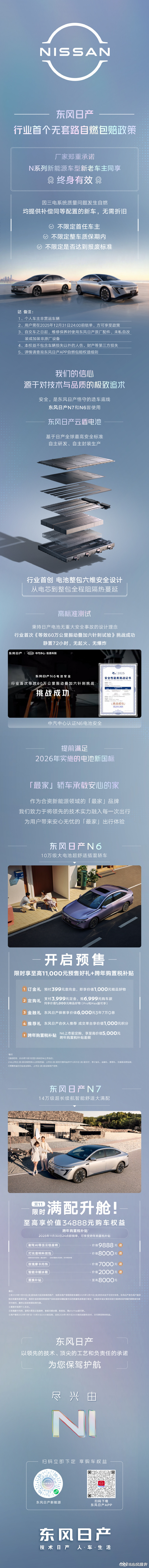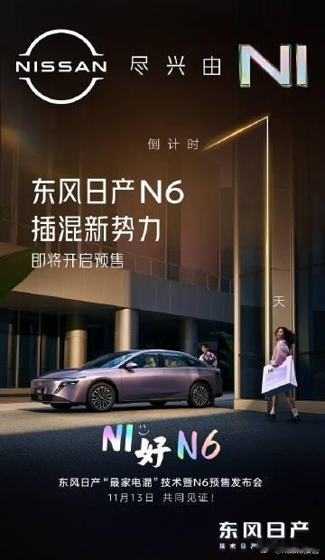 11月13日,东风日产N6经过两次重要活动发布亮相。日产中国40周年品牌之夜首次亮相,10月16日,日产中国在40周年品牌之夜全球首发了东风日产N6。新车定位为插混中型车,基于天演架构打造。活动上,官方宣布N6计划于四季度正式上市,并表示东风日产到2027年将推出10款新能源车型。11月13日开启预售,预售价为10.99-12.19万元,部分车型预售权益价低至10.69万元。车辆长宽高为4831×1885×1491mm或1494mm,轴距达2815mm,风阻系数0.248Cd。内饰方面,前排环抱式座舱采用双拼色设计,有15.6英寸2.5K悬浮中控屏。此外,车辆配置怀挡、手机无线充电等功能。智能辅助驾驶,搭载高通8775 x Momenta飞轮大模型 舱驾融合方案,体验更丝滑,功能更强大,该车搭载L2+级驾驶辅助功能,可实现车道巡航等。动力方面,N6配备NR15型号的1.5L发动机,最大功率75kW。搭配21.1kWh电池与功率155kW的驱动电机,CLTC纯电续航180km,亏电油耗2.79L/100km。
