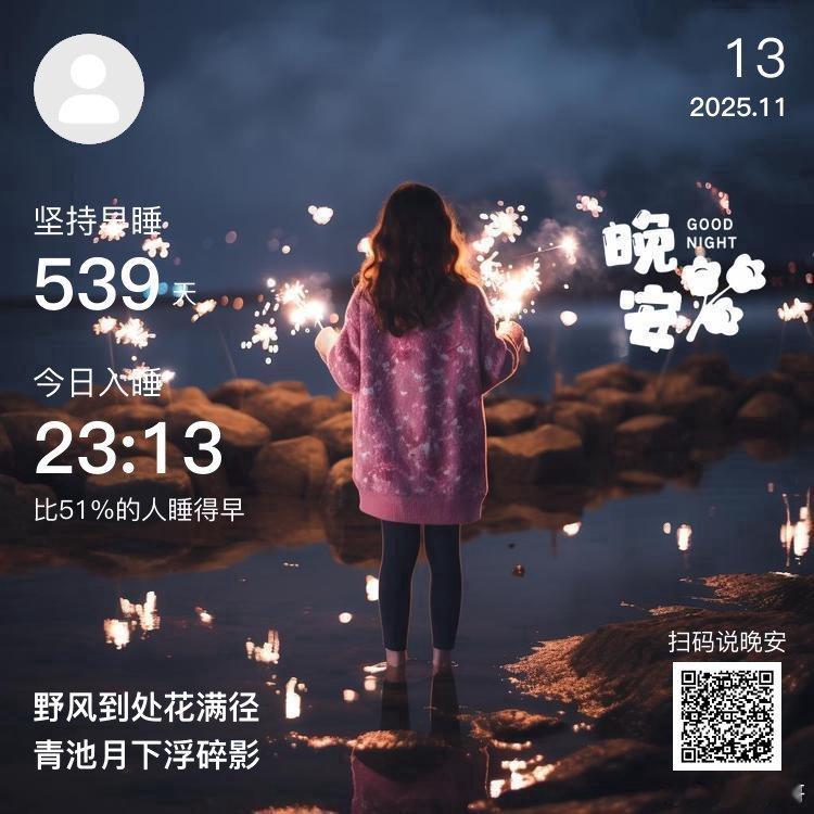 晚安,你已连续晚安打卡539天。不辜负自己,不将就生活,你的存在,配得上世间所有的美好!