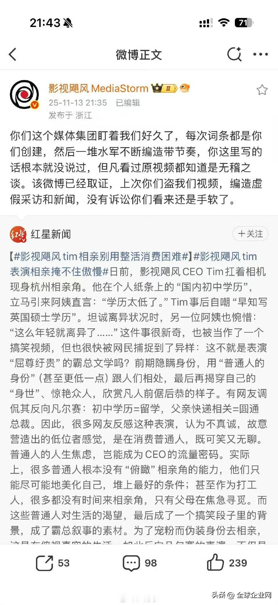 影视飓风称红星新闻是“媒体集团”,“编造假新闻”,称“没有起诉你们是手软了”