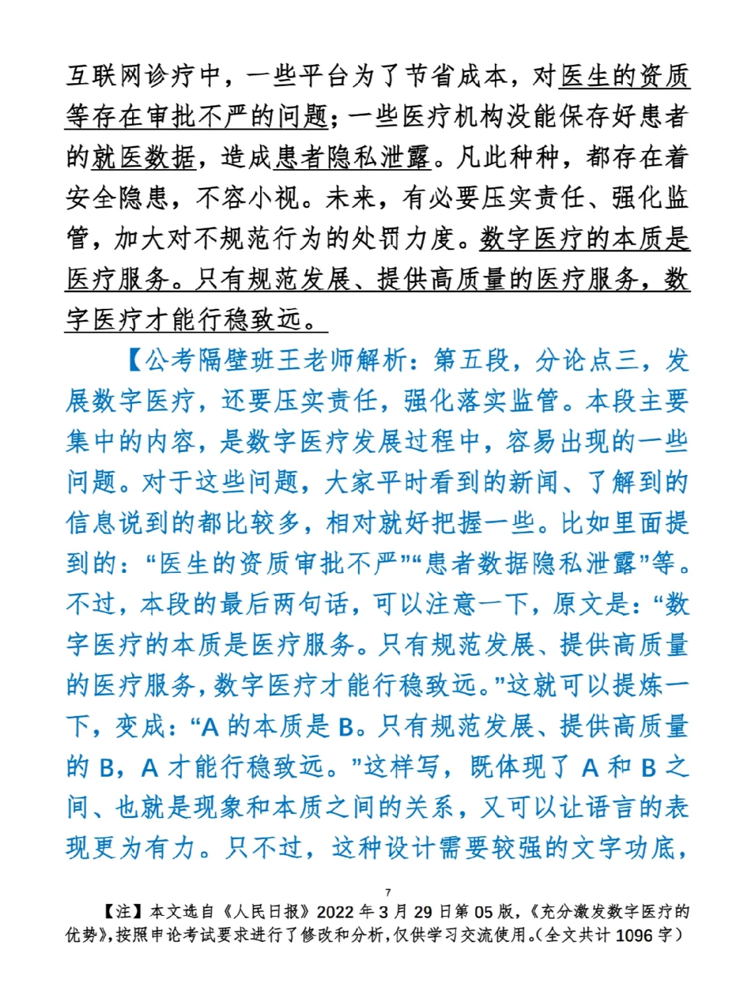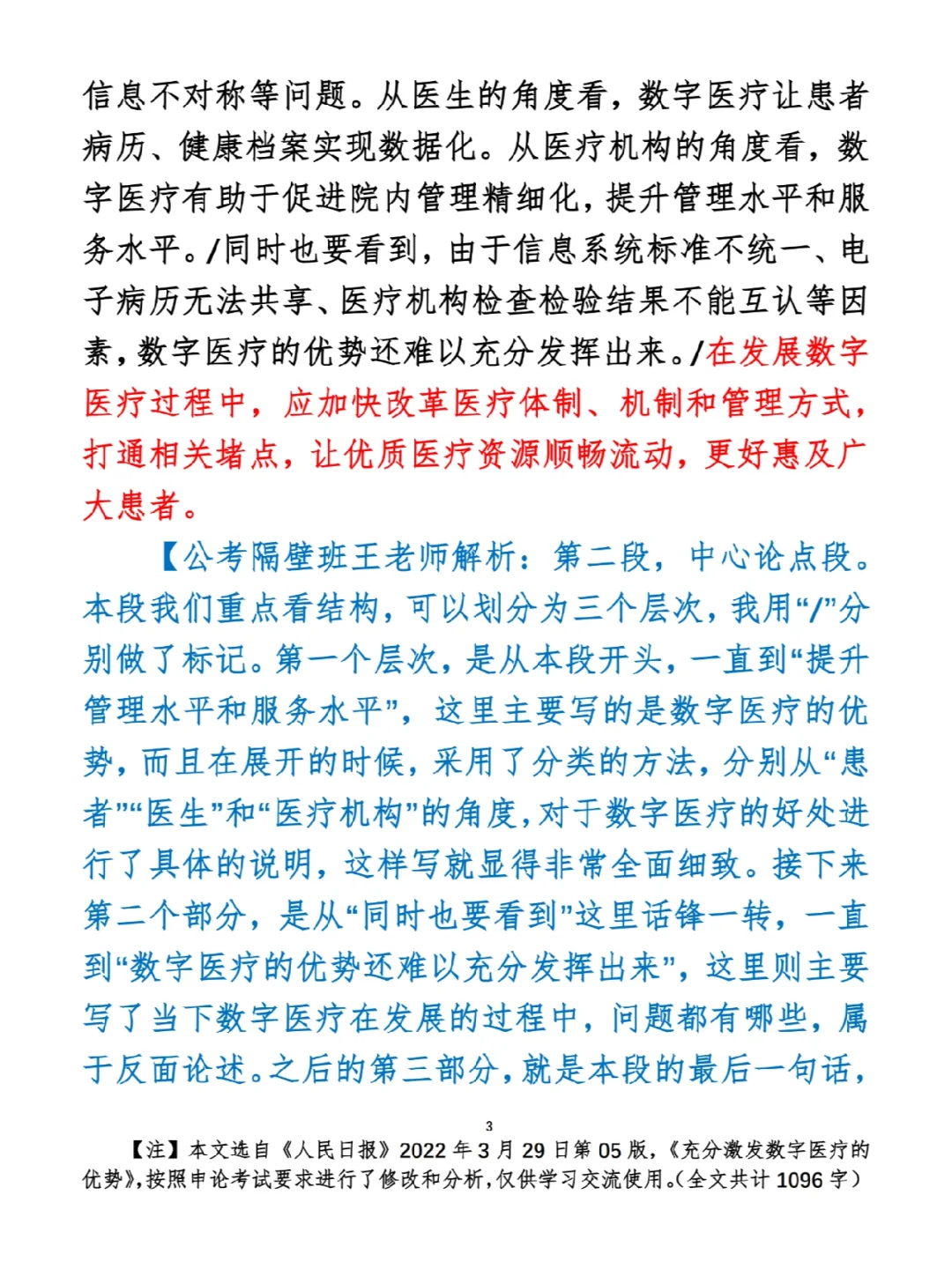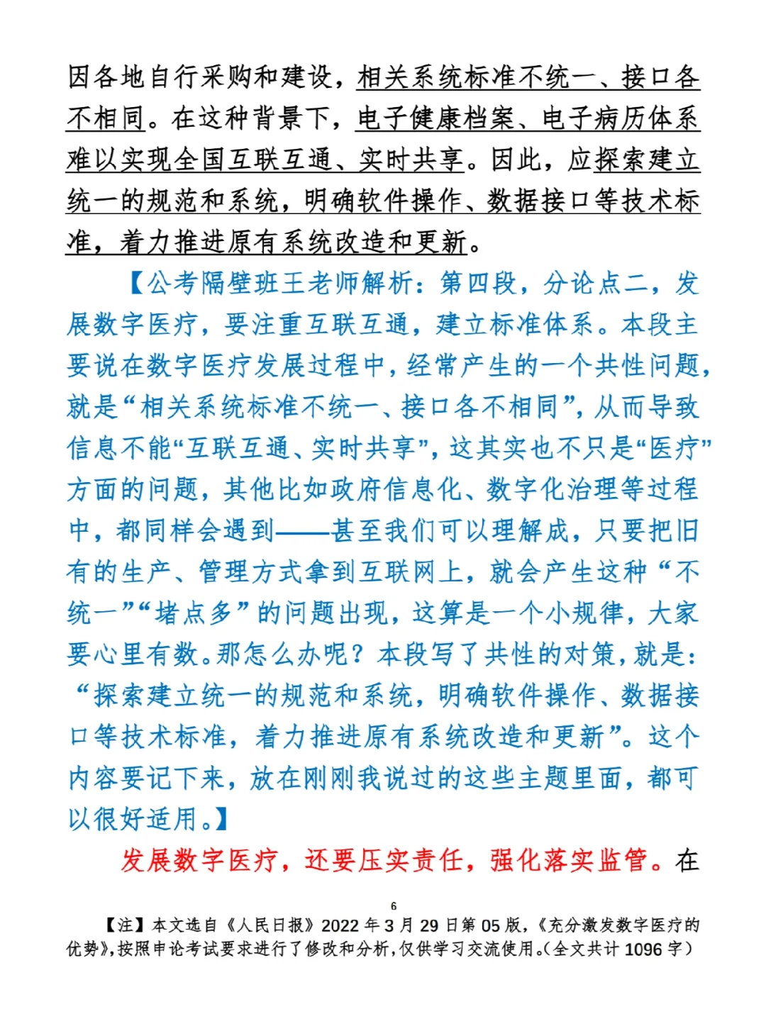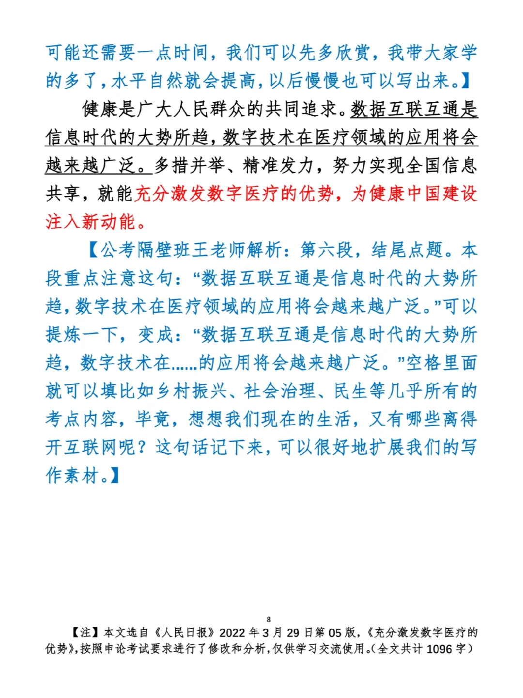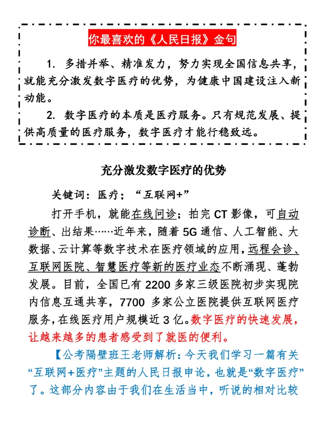 今日打卡作业: 1. 选一句你最喜欢的金句 2. 抄写全文红字+划线部分内容 3. 写完后在留言区打卡 ⭐️ ⭐️ ⭐️ ⭐️ ⭐️ ⭐️ 如何抄写:每天的抄写文章以图片形式发在“公考隔壁班王老师”账号,红色字是重点句和结构句,黑色字是正文,蓝色字是解析,大家抄写时不必抄蓝色字。建议先通读全文(包括蓝色解析部分),做到心中有数再开始抄写,效果会更好。 关于文章:抄写文章来源于人民日报,但每篇文章我都根据申论考试要求进行了修改,主要集中在四个方面:一是重写或修改开头、结尾;二是统一段首句句式结构;三是调整段落字数,使文章结构更均衡;四是简化复杂长难句,使之更具可模仿性。每篇文章修改幅度不同,无论修改多少,都是基于申论考试要求,毫无对人民日报文章品评之意。(此处致敬人民日报) 关于解析:我会在文章每段后面加一段蓝色字的解析,是我自己在抄写时的感悟,篇幅时间有限,不能面面俱到,但求重点突出。如果你有其他感悟,也希望能在评论里分享,我们相互学习、共同进步。 ⭐️ ⭐️ ⭐️ ⭐️ ⭐️ ⭐️ 这里是公考隔壁班王老师独创的“每天半小时・申论80分”抄写团,欢迎加入我们!