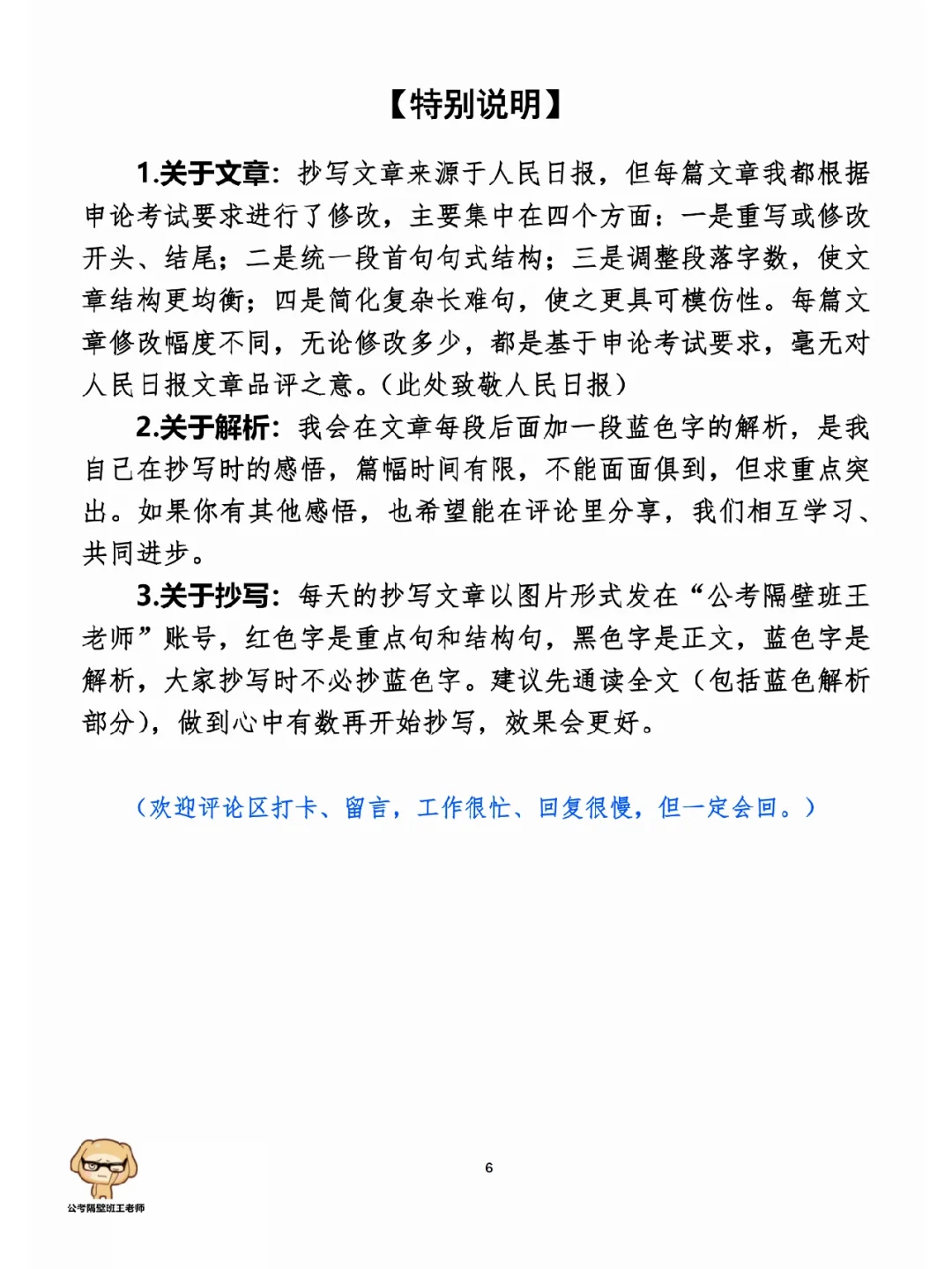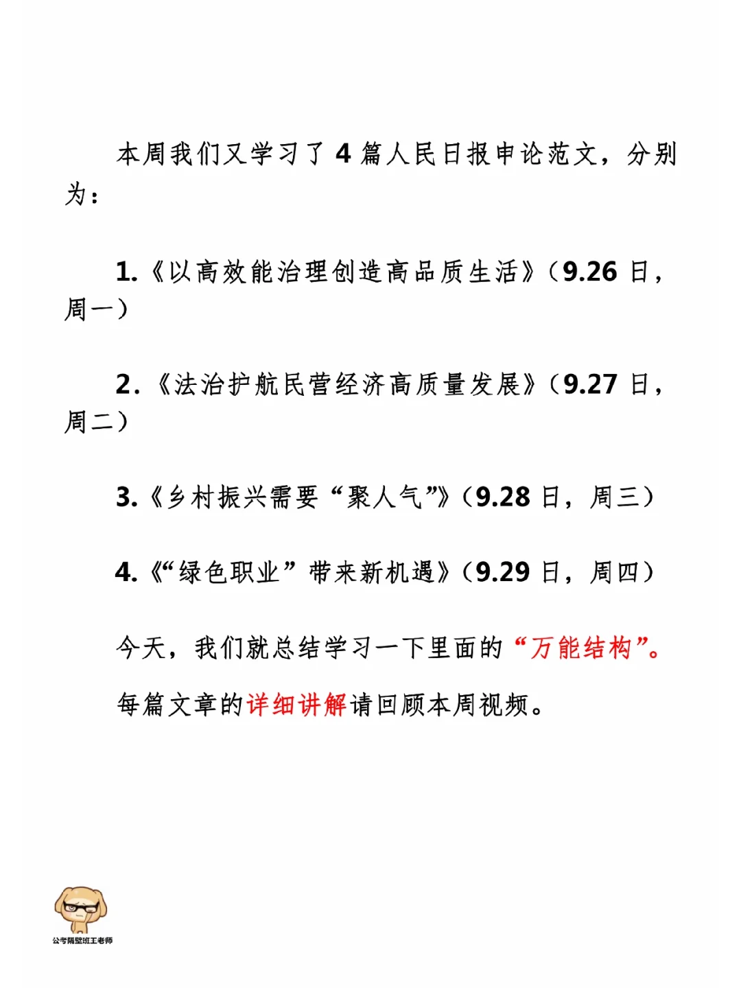 本周我们又学习了4篇人民日报申论范文,分别为: 1.《以高效能治理创造高品质生活》(9.26日,周一) 2.《法治护航民营经济高质量发展》(9.27日,周二) 3.《乡村振兴需要“聚人气”》(9.28日,周三) 4.《“绿色职业”带来新机遇》(9.29日,周四) 今天,我们就总结学习一下里面的“万能结构”。 每篇文章的详细讲解请回顾本周视频。 ⭐️ ⭐️ ⭐️ ⭐️ ⭐️ ⭐️ 这里是公考隔壁班王老师独创的“每天半小时・申论80分”抄写团,欢迎加入我们!