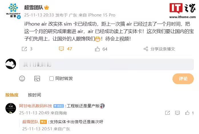 【】超雪团队今日发文,宣布苹果 iPhone Air 改实体 SIM 卡成功,并且已经成功读上了实体卡。有用户询问:“工程版还是量产版?”超雪团队回复:“支持实体卡出信号还是首次呀。”值得一提的是,今年 10 月,超雪团队发文,称其 eSIM 小程序“bleuicc”已正式上线,目标是“让所有手机都支持原生 eSIM,包括有锁机”。参考小程序页面,其中显示该团队使用蓝牙写入 / 启停 eSIM。