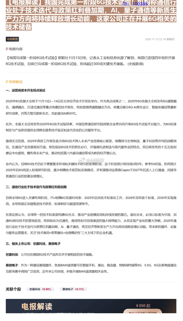 我国完成弟一阶段6G技通信行业处于技术迭代与政策红利叠加期,AI、量子通信等新质生产力方向将持续释放增长动能,这家公司正在开展6G相关的技术储备